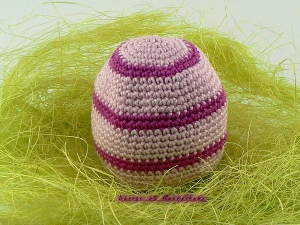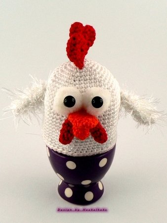 Die endgültige Größe ist je nach Garn, Nadelstärke und Häkelfestigkeit verschieden. Das Ei ist, bei festem Häkeln, ca. 7cm hoch und das Huhn ca. 9,5cm hoch. Der Aussendurchmesser beträgt ca. 6,5cm.