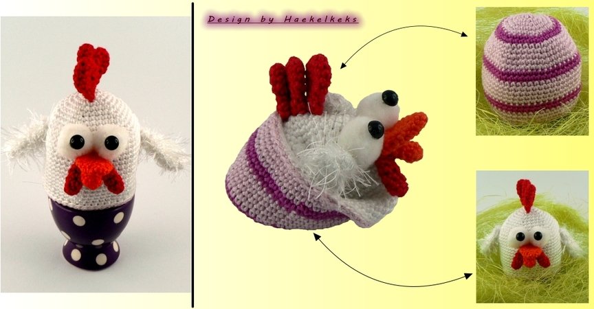 Zum Einen ist es ein ganz normaler Eierwärmer, zum Anderen kannst Du den Eierwärmer auch als Osterdeko im Osternest, entweder als Huhn oder als Ei, verwenden.