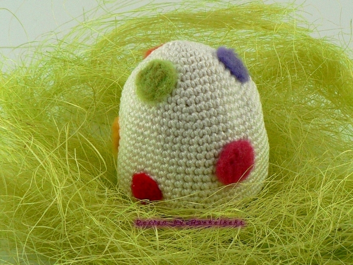 Die endgültige Größe ist je nach Garn, Nadelstärke und Häkelfestigkeit verschieden. Das Ei ist, bei festem Häkeln, ca. 7cm hoch und das Küken ca. 9cm hoch (inkl. Haare). Der Aussendurchmesser beträgt ca. 6,5cm.