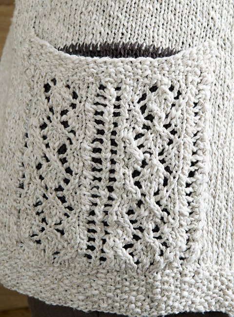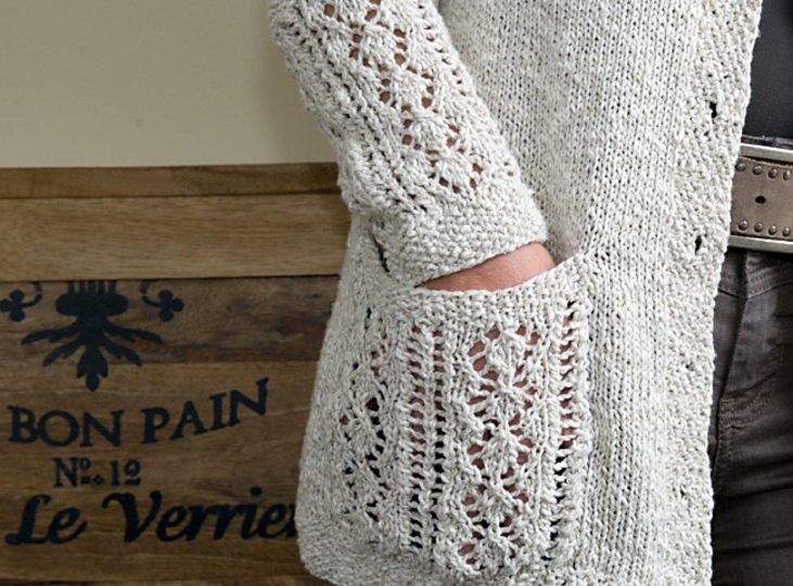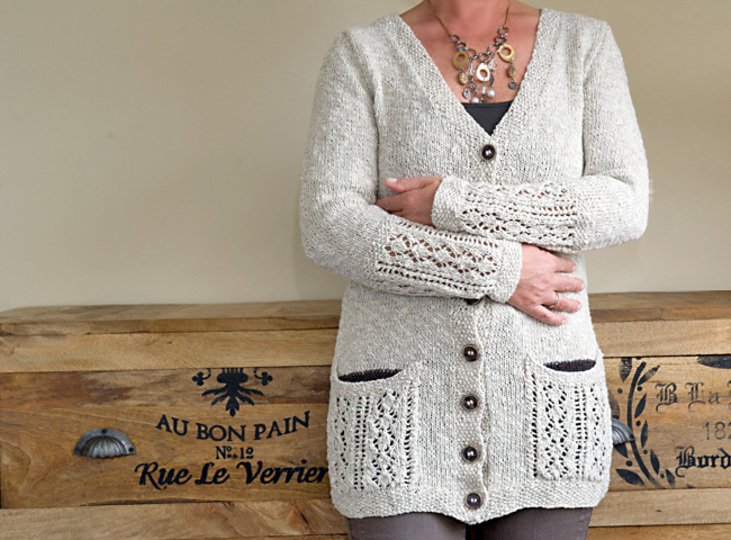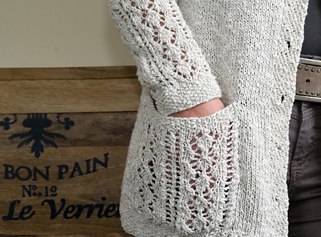 Anleitung für eine lange Strickjacke mit V-Ausschnitt und Lace-Elementen an Taschen und Ärmeln. Der Taschenbeutel wird aus kontrastfarbenen Garn gestrickt (hier in dunkelbraun) - aber natürlich kann man ihn auch in derselben Farbe stricken wie den übrigen Cardigan.