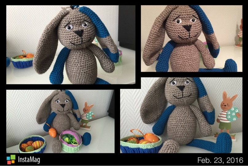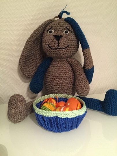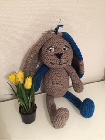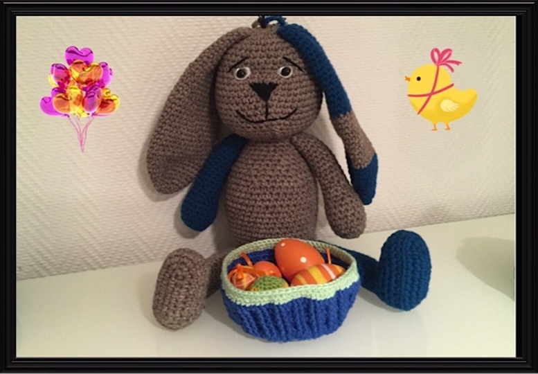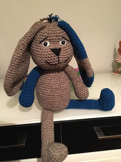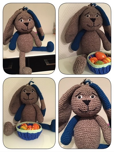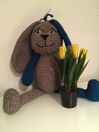 Der Hase Peppi wird bei der Verwendung von Bosten Wolle von Schachemnayr und einer Häkelnadel 4,0 sitzend ca. 26 cm und von Kopf bis Fuß stolze 45 cm groß