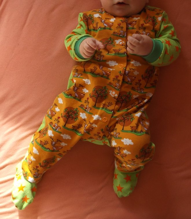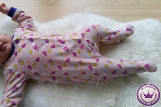 Gemütlicher Schlaf- und Strampelanzug mit Knopfleiste vorne, welcher mit oder ohne Füßchen oder als sommerlicher Spieler mit kurzen Armen und Beinen genäht werden kann, in den Einzelgrößen 50-110.