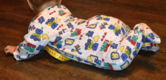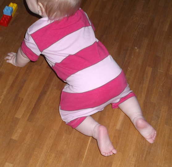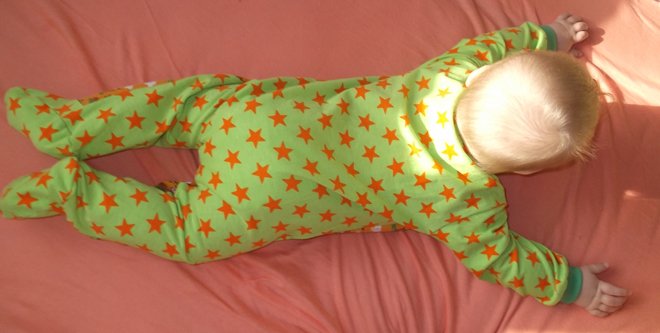 Der Einteiler ist sehr weit geschnitten und auch geeignet für Stoffwindeln. Die Fußgröße ist großzügig bemessen.