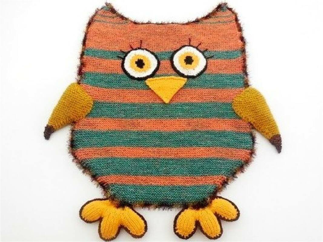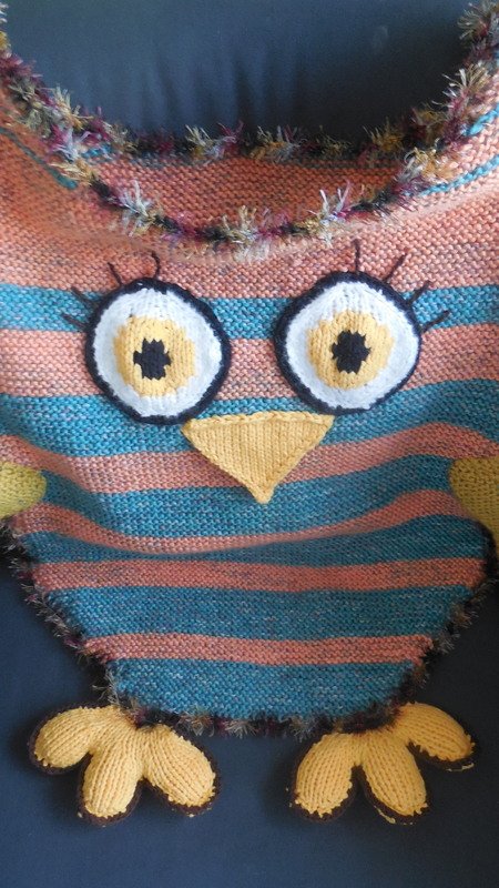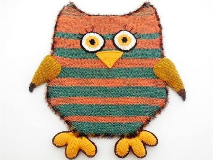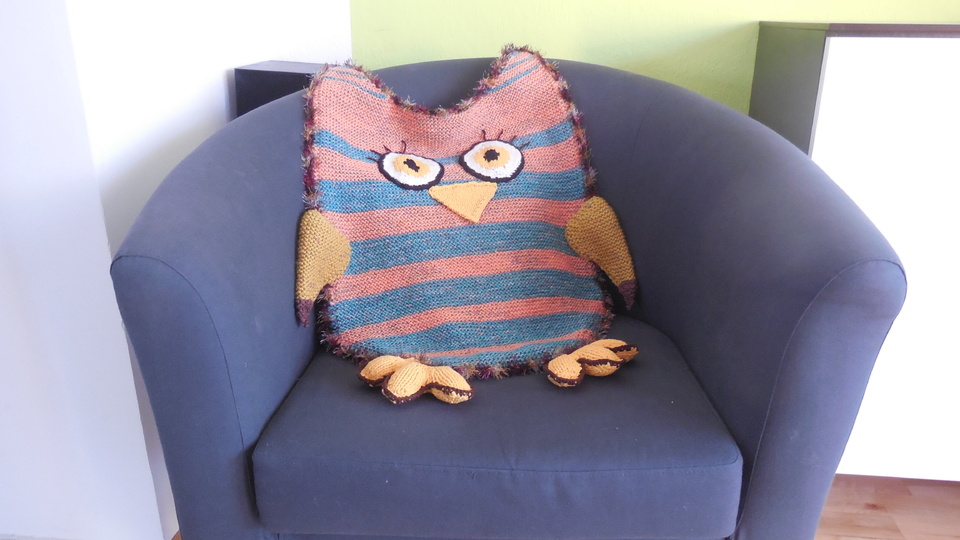 Diese Eulendecke ist sowohl als Schlupfdecke oder Fußsack, als auch als Riesenkissen, oder mit dünnerer Wolle gestrickt, als normales Kissen verwendbar.