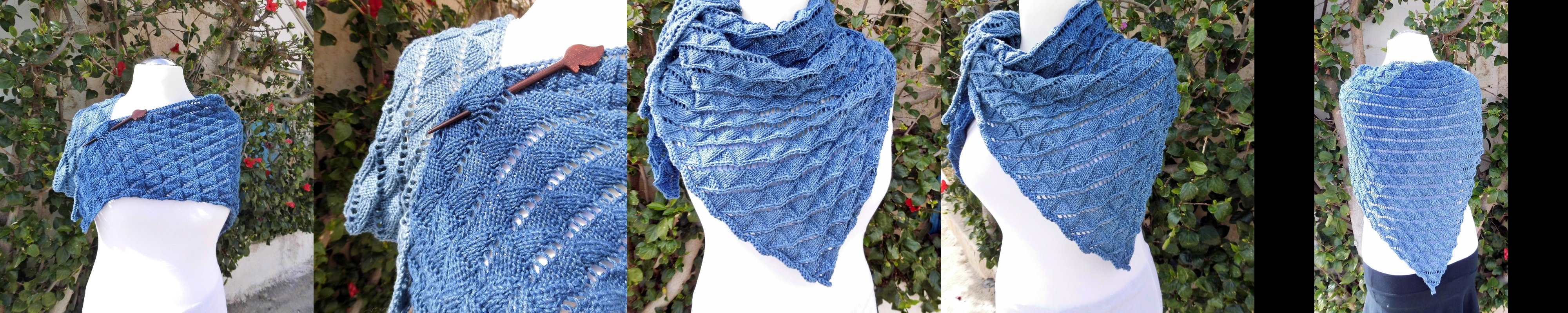 Stadiaka war ursprünglich “nur” ein asymetrisches Dreieckstuch, dessen Größe durch die verarbeitete Garnmenge und Garndicke variiert. Schritt für Schritt, nach und nach entsteht durch Wiederholungen des Mustersatzes dieses schöne leichte Tuch. Und das sagt auch der Name - stadiaka bedeutet auf griechisch “nach und nach” “schrittweise”.