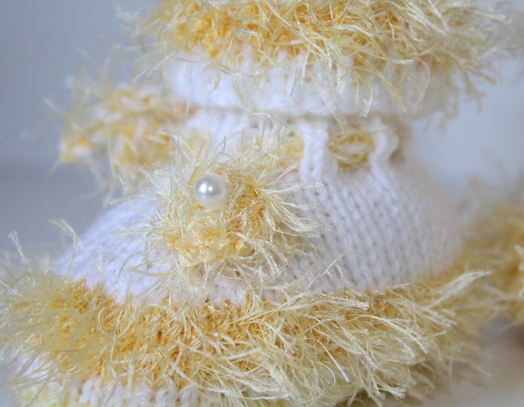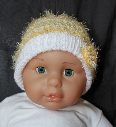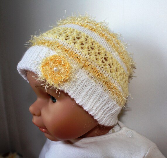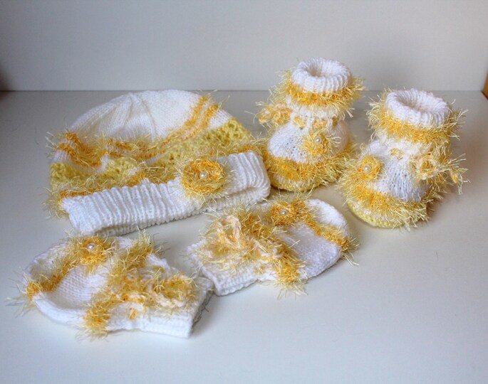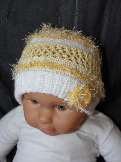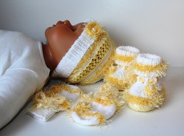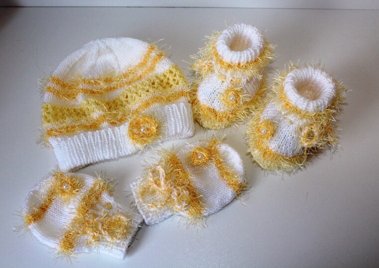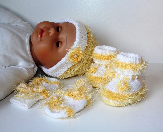 Mit diesem Baby-Set wird jedes Baby zu einer kleinen Prinzessin. Für das komplette Set benötigen Sie jeweils 1 Knäuel á 50 g in Weiss und Gelb von Schachenmayr "Baby bzw. Baby Smiles" mit einer Lauflänge von 185 m / 50 g sowie einen Knäuel Fransengarn / Effektgarn, z. B. Brazilia von Schachenmayr oder Jamaika Effekt-Strickgarn. Nur in weiss gestrickt ergibt sich sofort eine schöne Taufgarnitur.