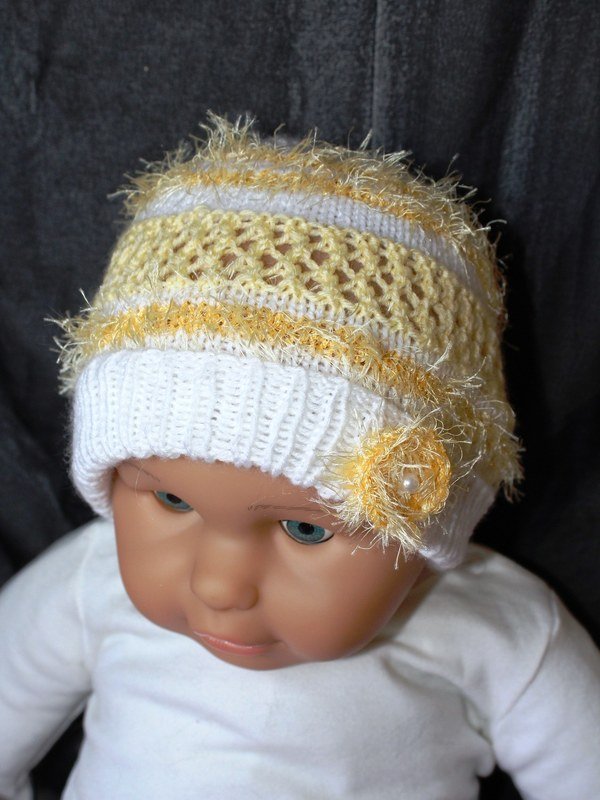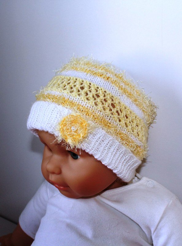 Baby-Mütze "Mia" wurde aus Bravo Baby Smiles mit einem Nadelspiel in Stärke 3,5 gestrickt. Mit der genauen Schritt-für-Schritt-Anleitung gelingt auch Anfängern diese Mütze mit Lochmuster, die mit weissem Fransengarn gestrickt auch als Taufmütze verwendet werden kann.