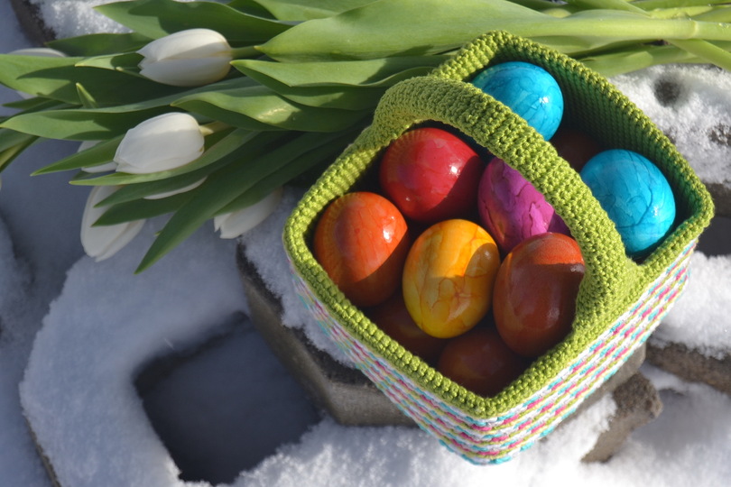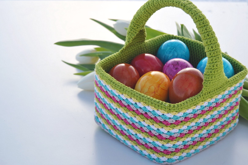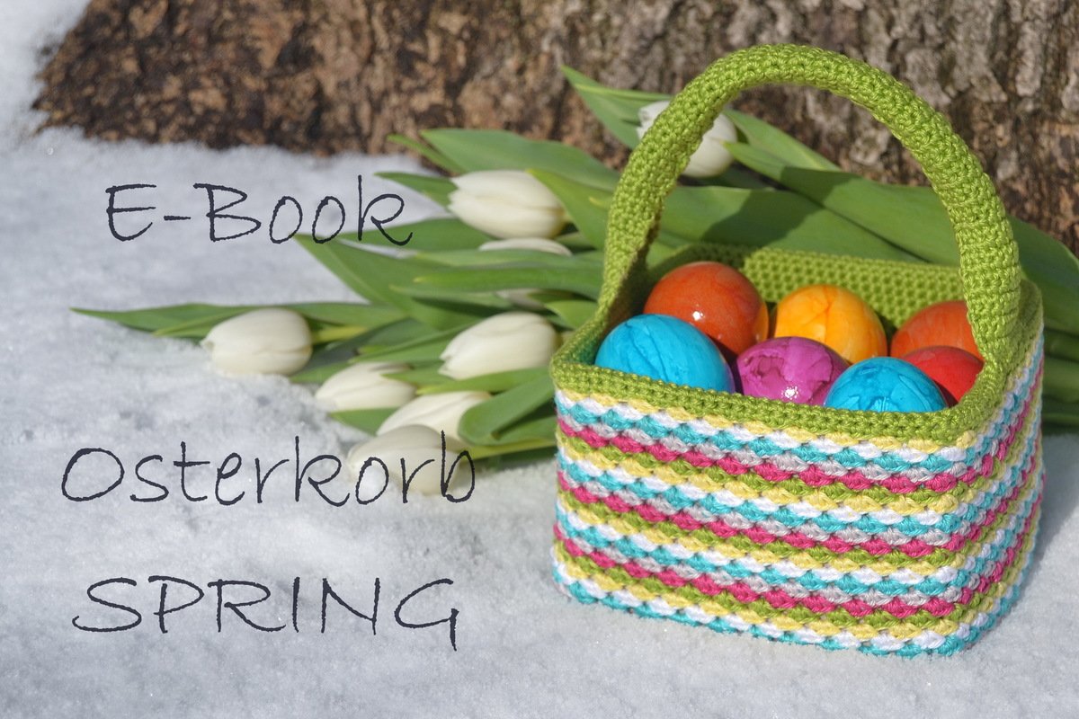 Dieser farbenfrohe frühlingsfrische Korb ist sehr stabil und daher sehr vielseitig einsetzbar. Das Muster besteht nur aus festen Maschen, was auch Häkelanfänger schaffen. Der Korb wird am Ende mit Karton oder Pappe verstärkt, etwas zeitaufwendig und fummelig, aber die Arbeit lohnt sich. Es ist ein ganz besonderes Modell mit viel Platz für Osterüberraschungen, Geschenke zum Geburtstag oder später für anderen Krimskrams.