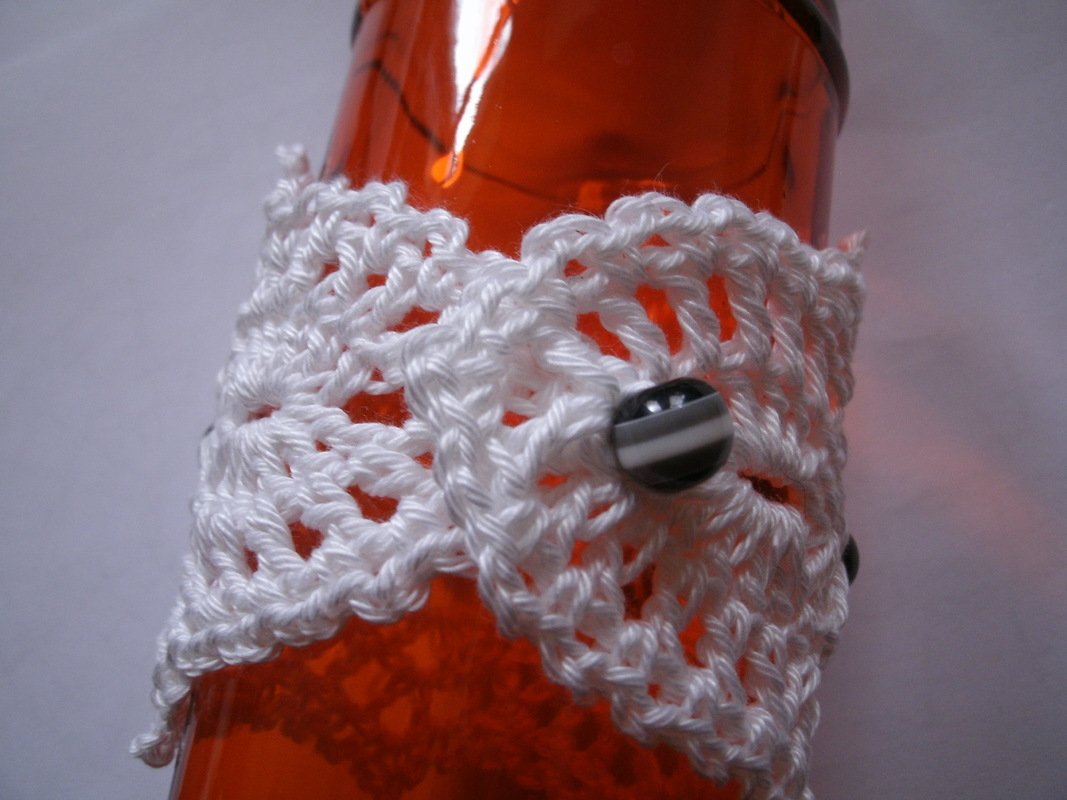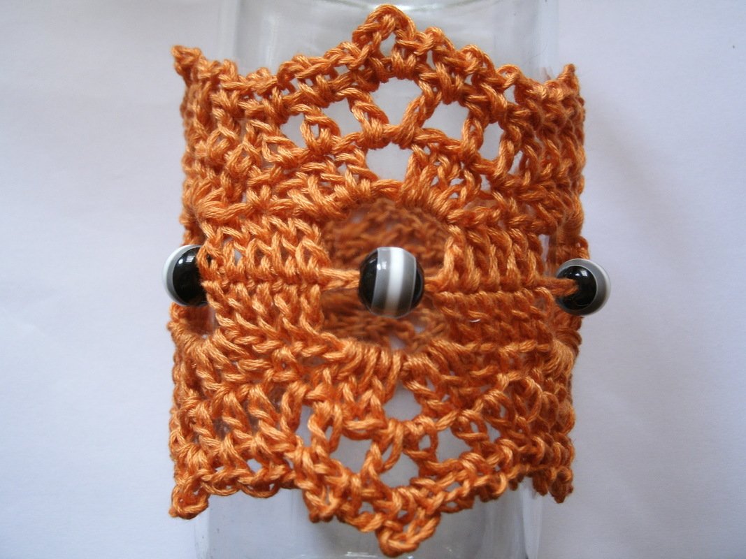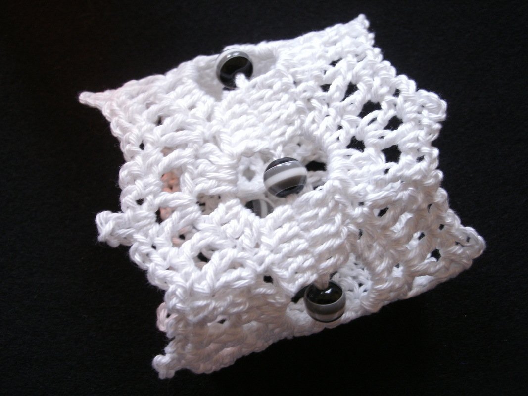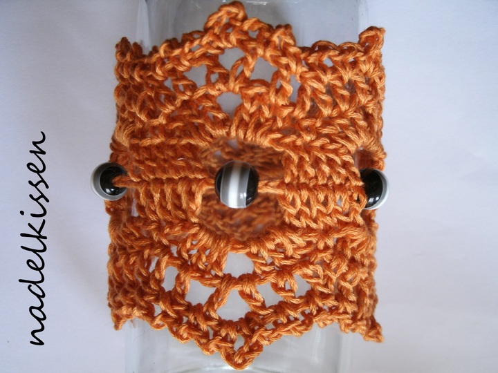 Ein sehr schöner Handgelenkschmuck, passend jetzt, wo die Pullis langsam wieder kürzer werden. Dieses Armband sieht in allen Farben schön aus und kann in 2 Größen für schlanke und kräftigere Handgelenke gehäkelt werden. Mit Häkelnadel und Garnstärke kann man noch weiter varieren. Diese Häkelei sieht auch als Ausschnitteinsatz sehr gut aus.