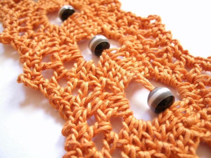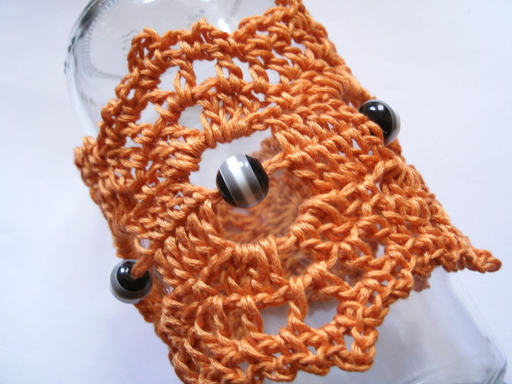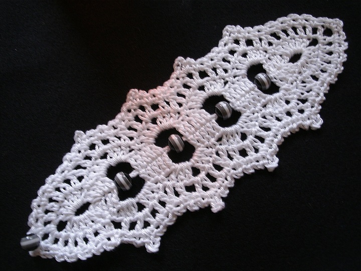 Das Armband wird mit dünneren bis mittlerem Baumwollgarn und Häkelnadel 2-2,5 gearbeitet, man benötigt außerdem einige Perlen.