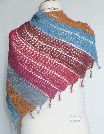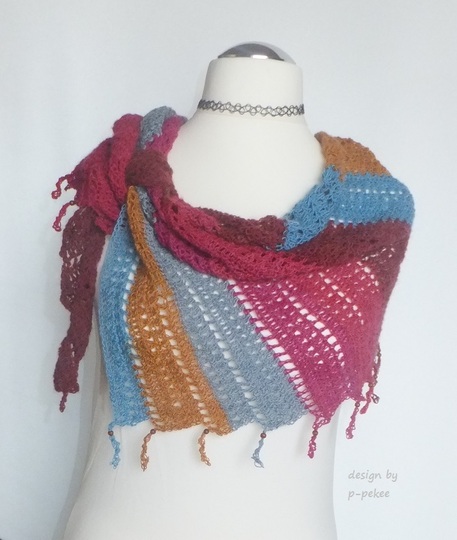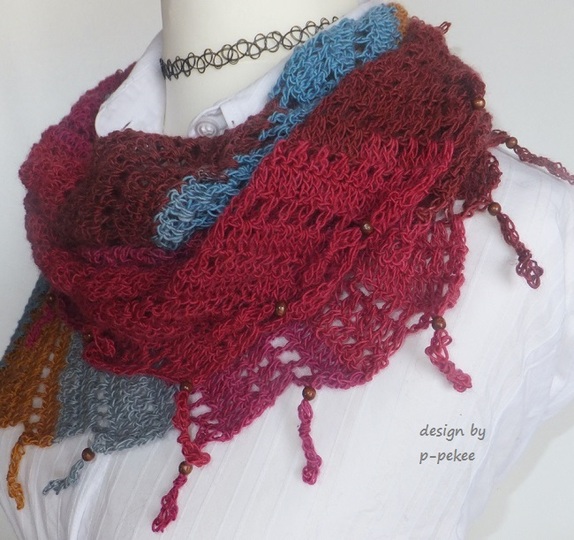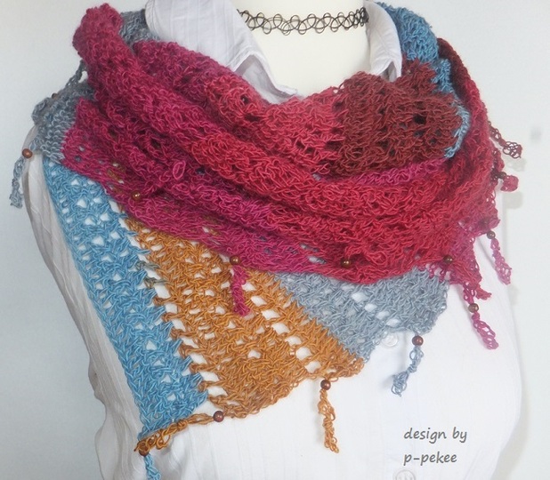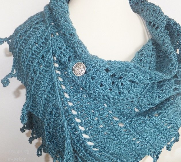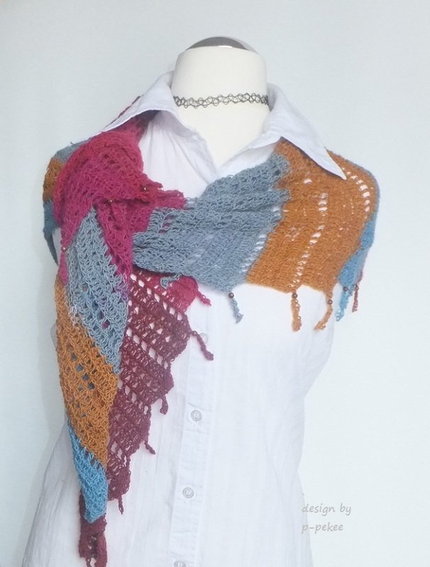 Das Tuch kann bei Verwendung von dünner Wolle mit Perlen aufgepeppt werden. Zusätzlich trägt sich das Tuch auch sehr gut mit einem variablen Knopf. Somit kann es individuell zugeknöpft werden.