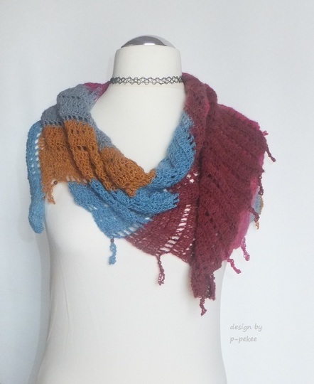 Aufgrund des Musters (Lochmuster / Stäbchenmuster) ist der Drachenschwanz schön locker => somit ein super toller Halsschmeichler. Mit den Fransen bei den Zacken wirkt er zusätzlich verspielt. Der Schal ist daher ein einzigartiges Mode-Accessoires.