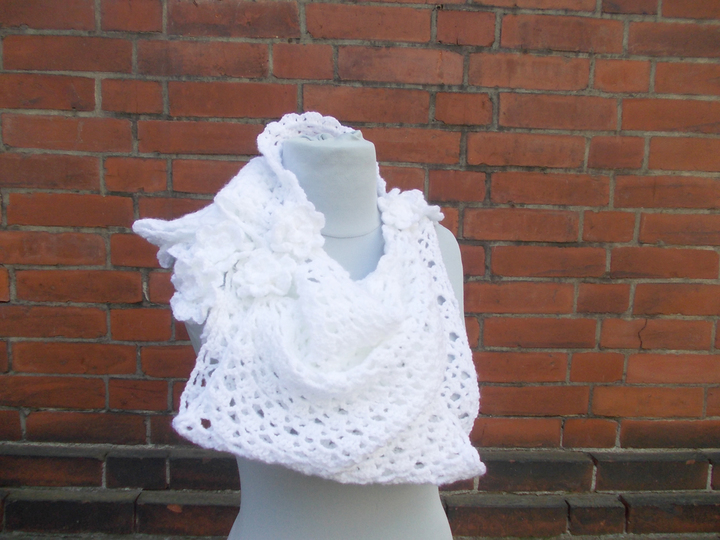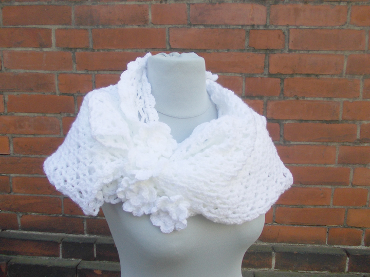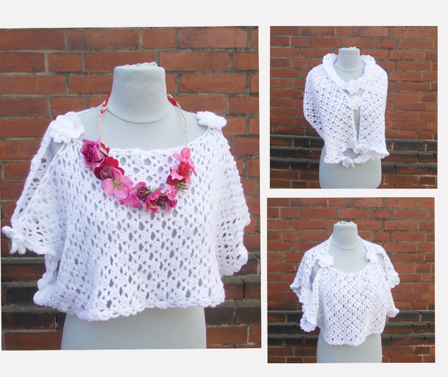 Unglaublich viele Tragevarianten. Es ist auch möglich, ds Modell mit mehr Häkelblüten als Aufnäher oder als Broschen oder an den Seiten zu verzieren, Anleitungen gibt es in meinem Shop (Häkelbänder, diverse Anleitungen für Häkelblumen). Die für dieses Modell entworfenen Häkelblumen beschreibe ich natürlich in der Anleitung.