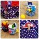 Nähe es aus abwischbarem Wachstuch in zwei Farben. Es hat 7 unterschiedlich große Außentaschen für das Spielzeug, das mit dem angebrachten Gummiband einen festen Halt hat. Die mit einem Druckknopf verschließbare Tasche ist wichtig für wertvolle Kleinigkeiten.