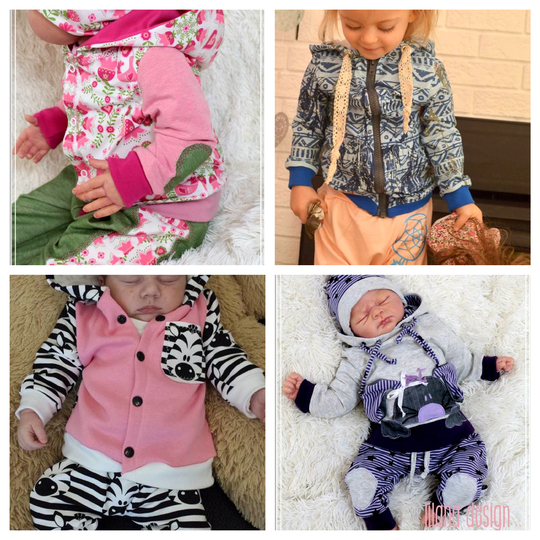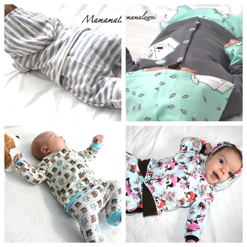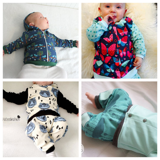 Mit diesem Ebook könnt ihr eurem Baby einen gemütlichen Jogginganzug nähen. Er besteht aus einem langärmeligem Oberteil, wahlweise mit Kapuze und einer Hose. Diese könnt ihr mit Bündchen oder Gummizug am Bauch nähen. Die Hose ist so geschnitten, dass auch ein dicker Windelpopo genug Platz hat.