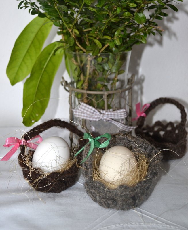 Ich habe die Körbchen aus paar Reste handgesponnene Wolle gemacht, du kannst aber alle mögliche Reste Wolle, Baumwolle oder Effektgarn nehmen , einfarbig oder bunt, alle werden bestimmt bübsch aussehen.