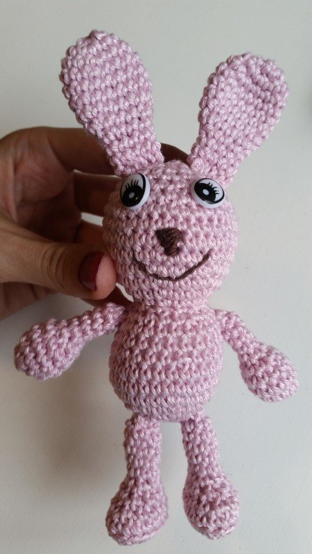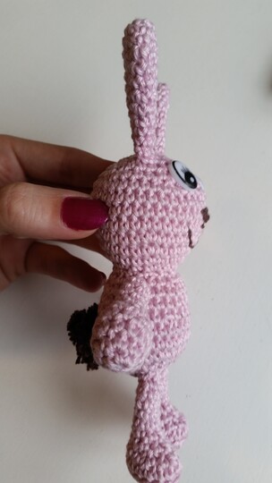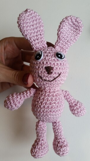 Meine sizilianische Schwägerin erwartete vergangenes Jahr eine Großnichte und wollte zur Geburt hinunter fliegen. Sie bat mich, für das zu erwartende kleine Mädchen ein Häkeltier als Mitbringsel zu fertigen. Unter anderem habe ich diesen Hasen - auch in rosa, aber mit aufgestickten Augen (Säugling!) gehäkelt. Sie konnte unter 3 verschiedenen Stücken wählen und hat sich für den Hasen entschieden. Auf italienisch habe ich dann von den glücklichen Eltern ein begeistertes Dankeschön erhalten und Google-Translator sei Dank auch lesen können. Seitdem sehe ich auf fast jedem Foto, das meine Schwägerin mir von der Kleinen zeigt das Häschen immer mit dabei.