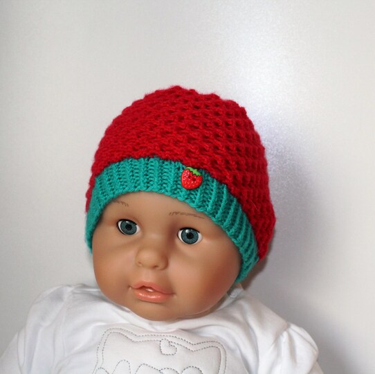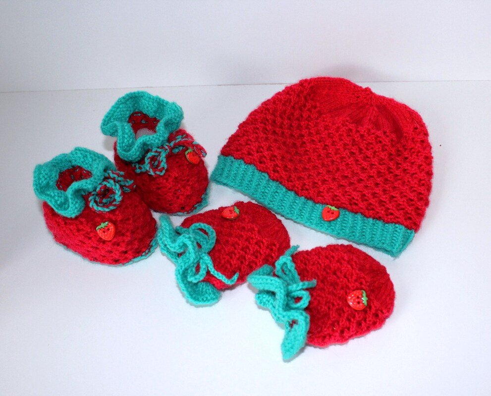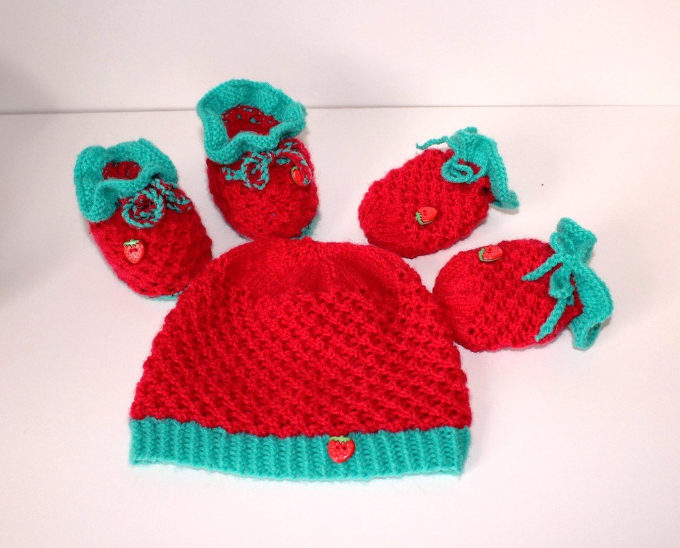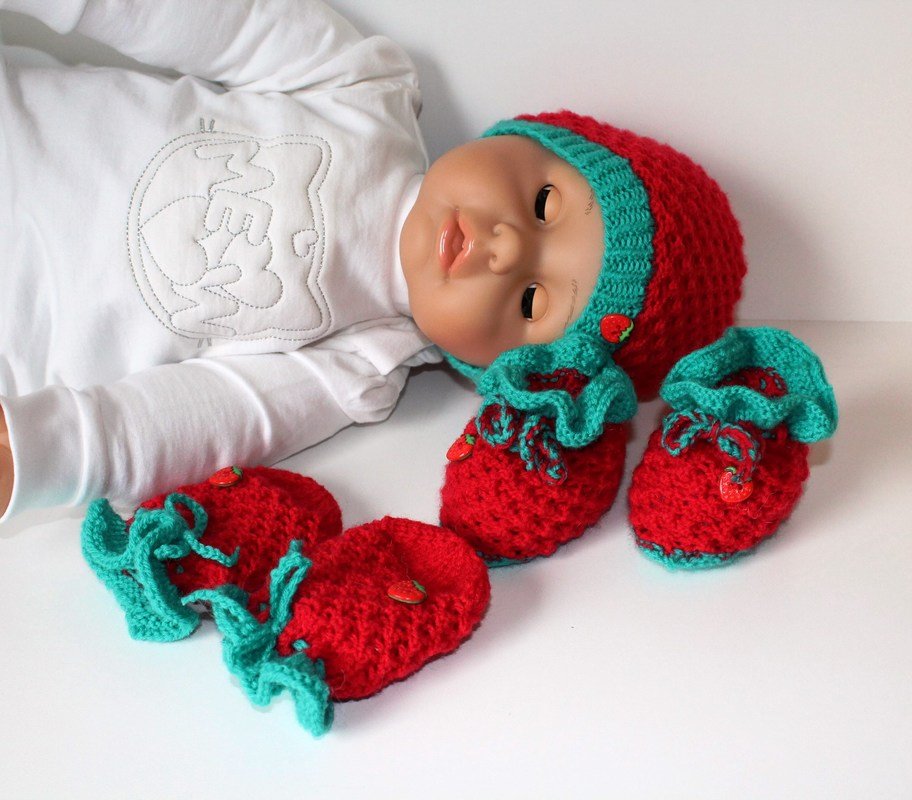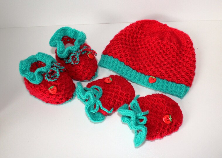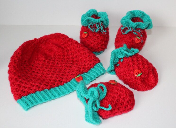 Strickanleitung Baby-Set "Erdbeere", Mütze, Booties, Handschuhe, ca. 4 - 10 Monate