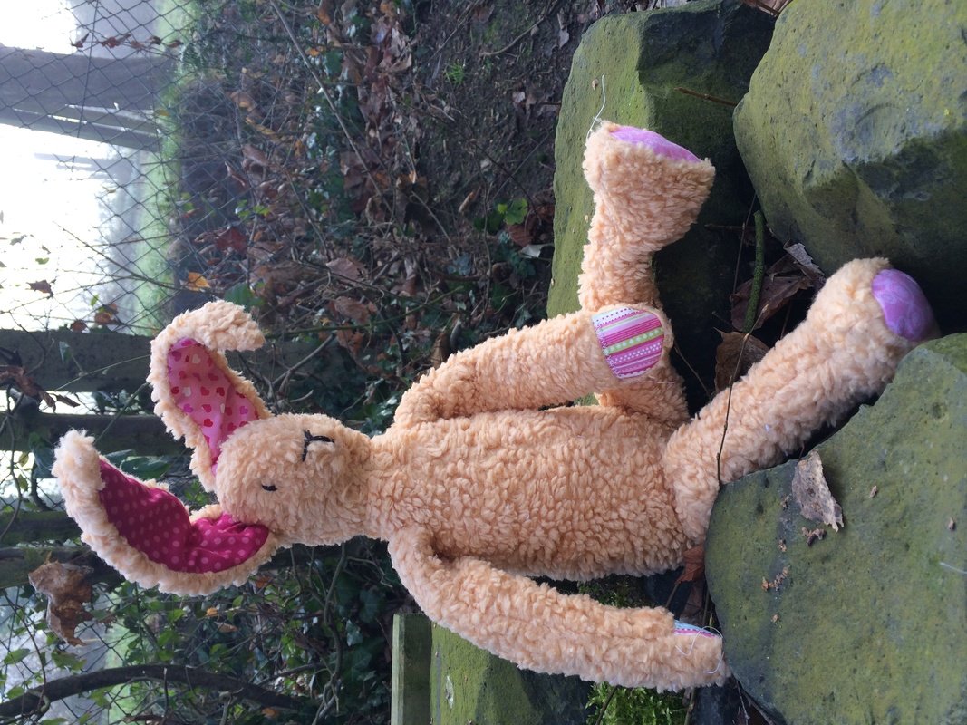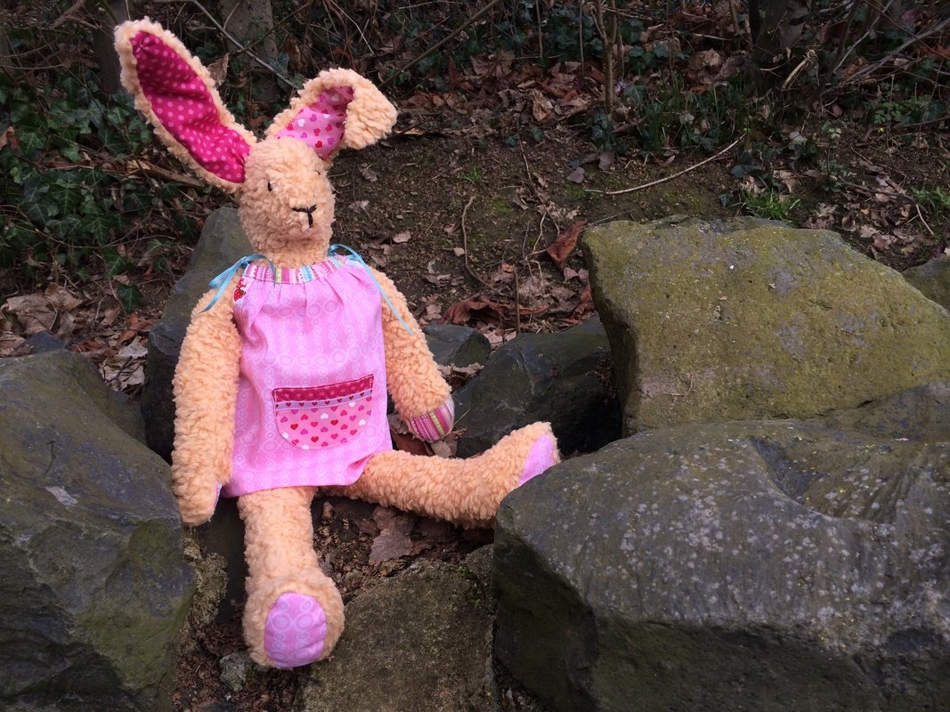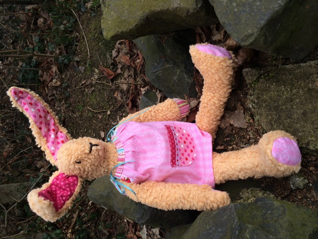 Aus weichem Ökofell genäht und mit verschiedenen Baumwollstoffen kombiniert ist er ein richtiger großer Hingucker, denn er misst von Ohrspitze mit Fußsohle 55cm.