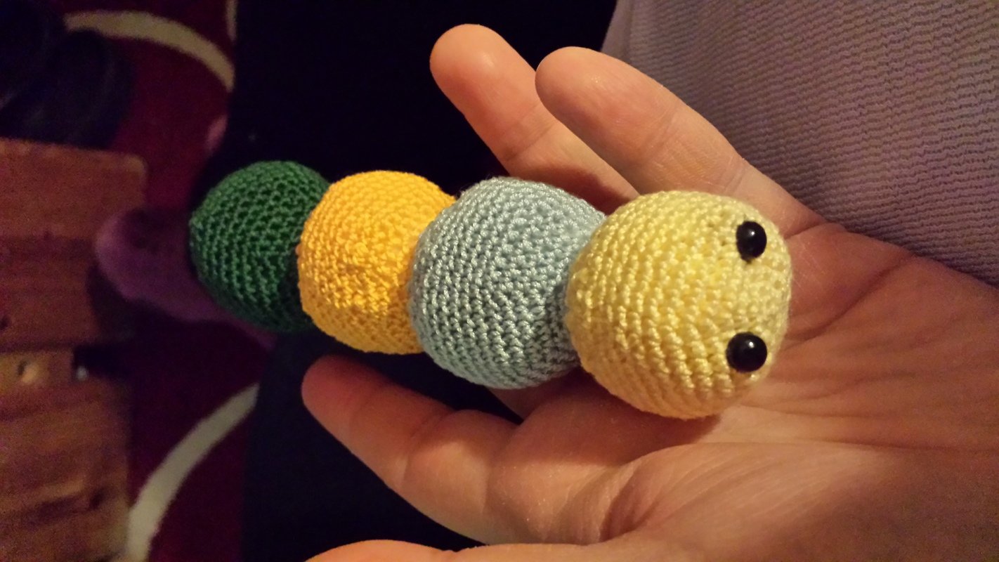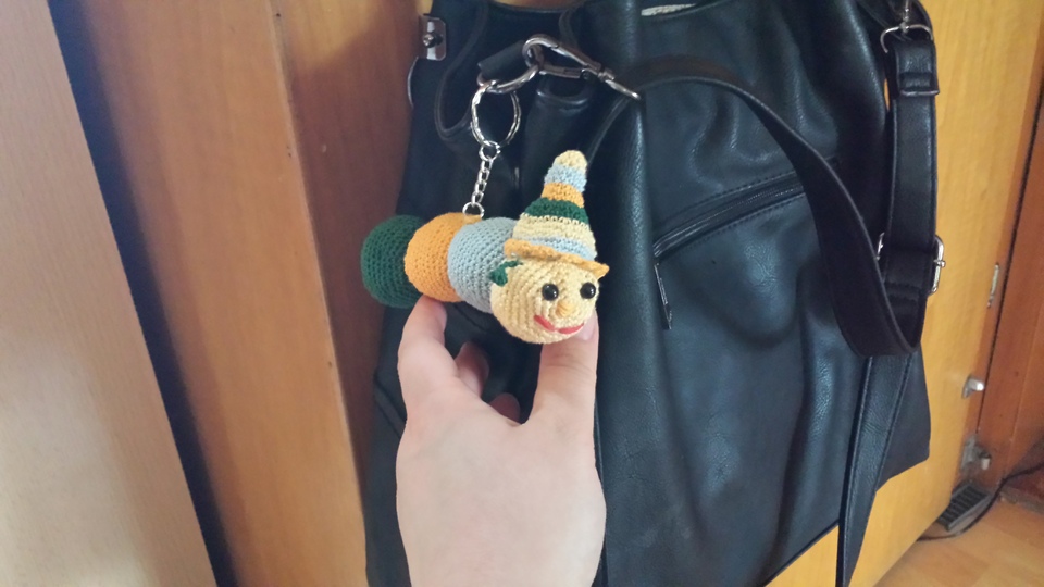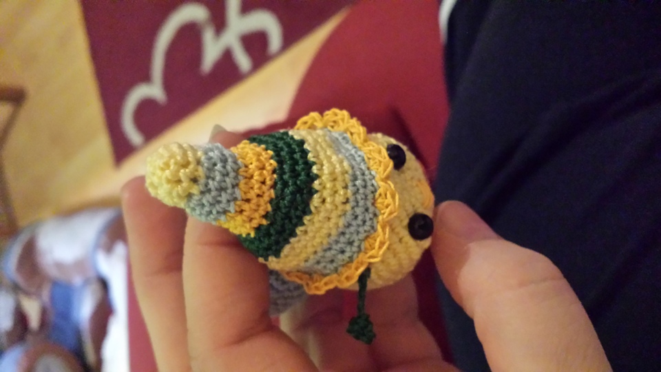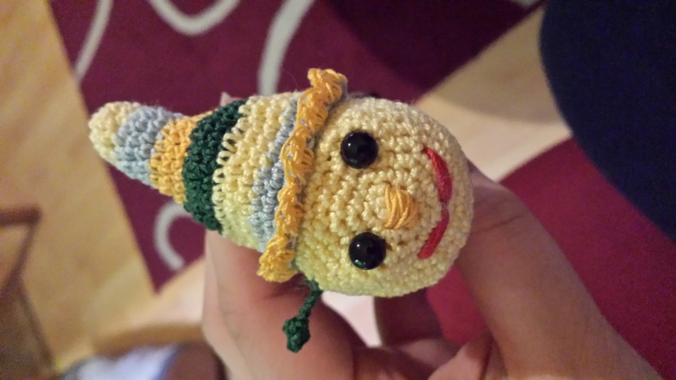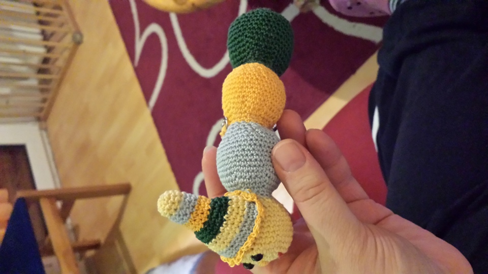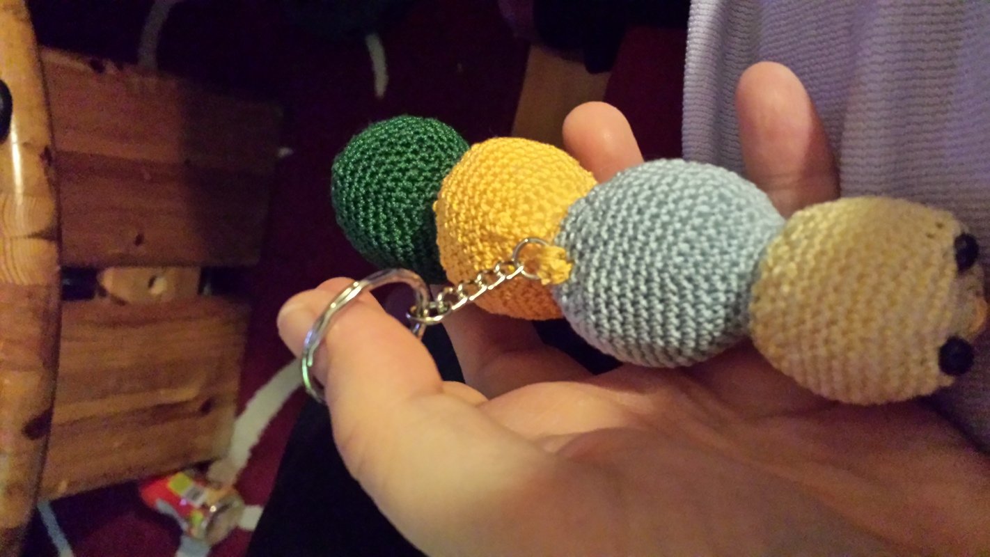 Hier gibt es nun die Mini Variante von der Kuschelraupe. Diese ist 14 cm groß und kann je nachdem wie man den Anhänger aufnäht für die Tasche oder als Schlüsselanhänger verwendet werden. Sie wird auch in Spiralrunden am Stück gehäkelt. Nur der Fühler und die Mütze müssen extra dran genäht werden.