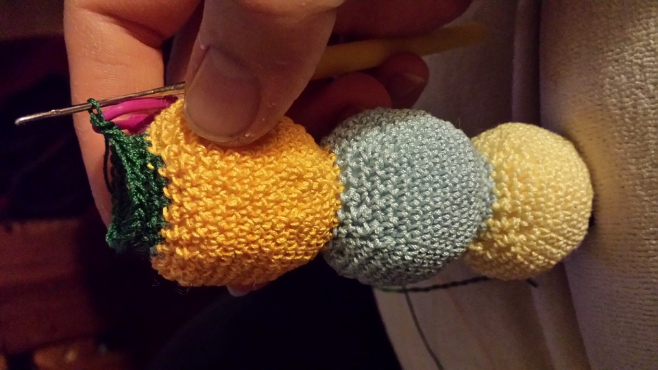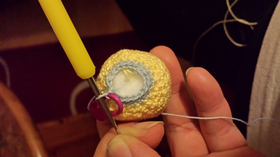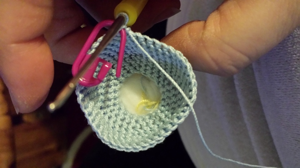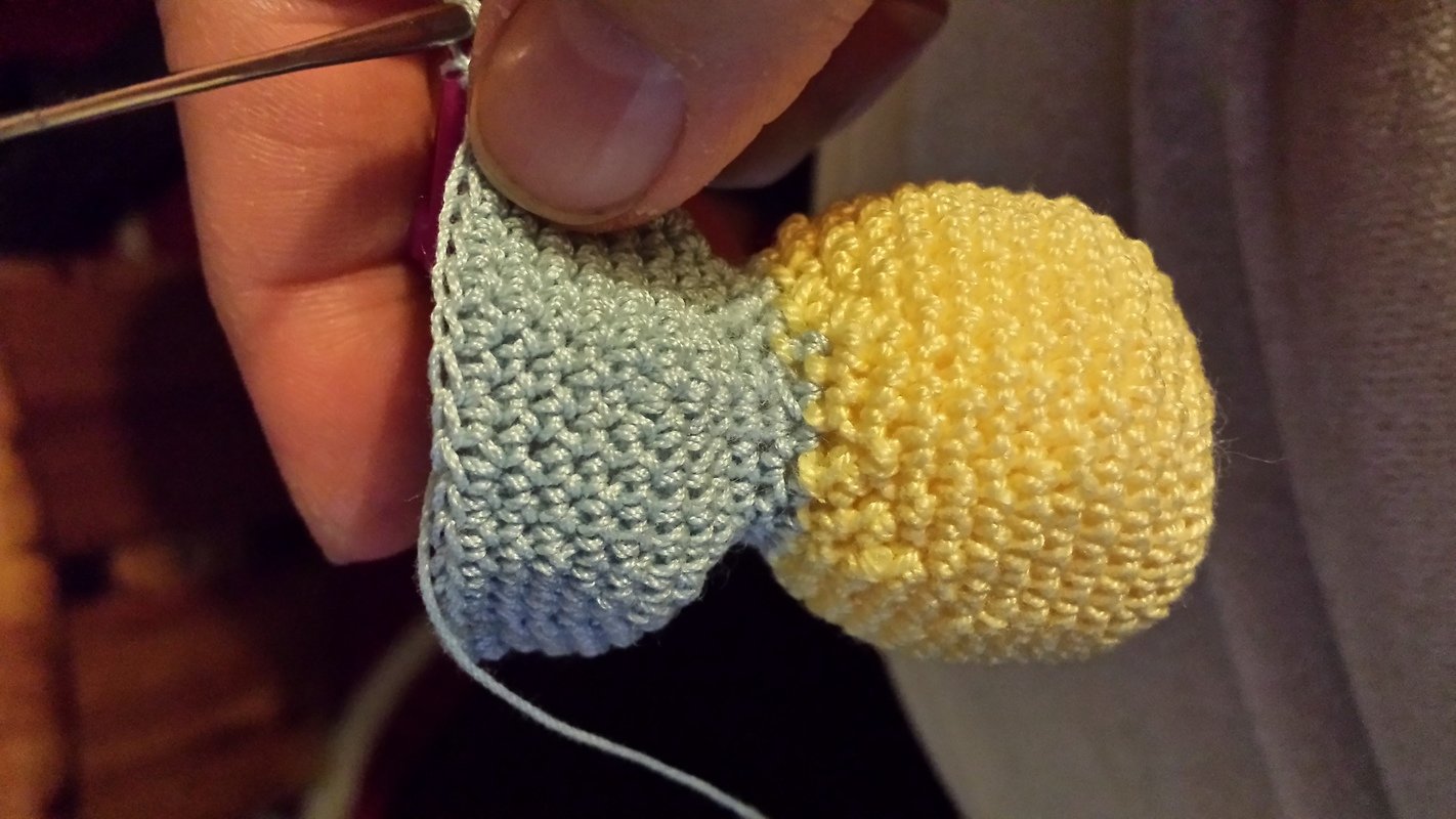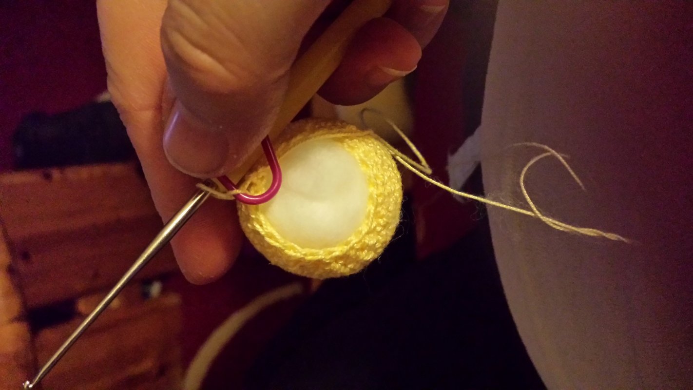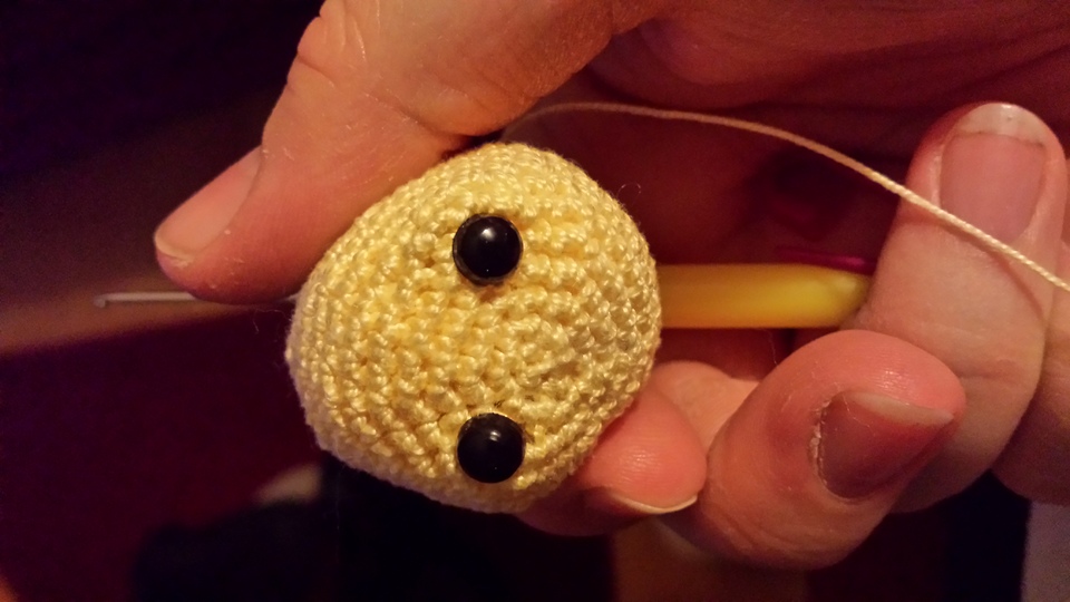 Material ist diesmal ein dünnes Häkelgarn in verschiedenen Farben, eine Nadel in Stärke 1,5, Sicherheitsaugen in schwarz 6mm, Maschenmarkierer, Füllmaterial und eine Sticknadel.