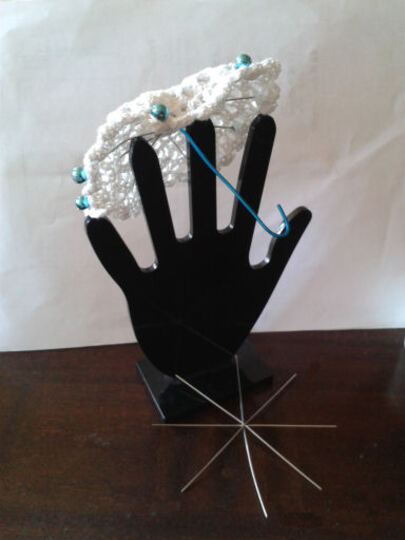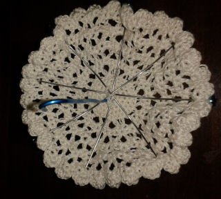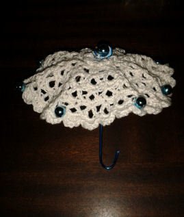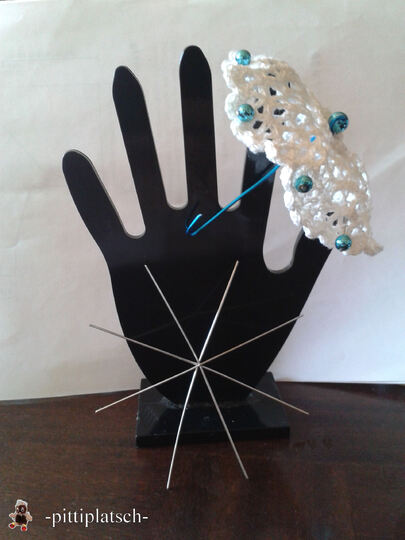 Zartes Filetmuster im Schirm mit blauen Perlen und passendem Draht.