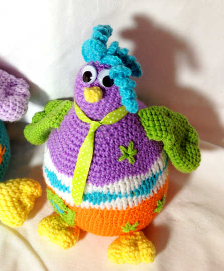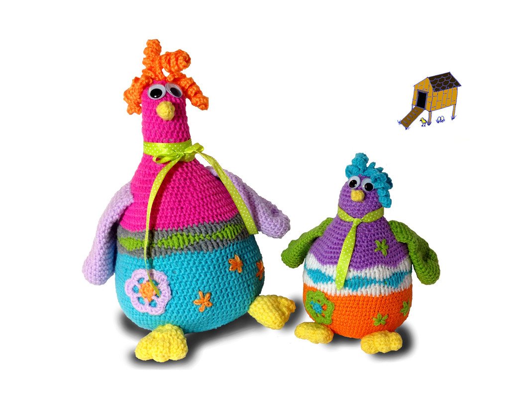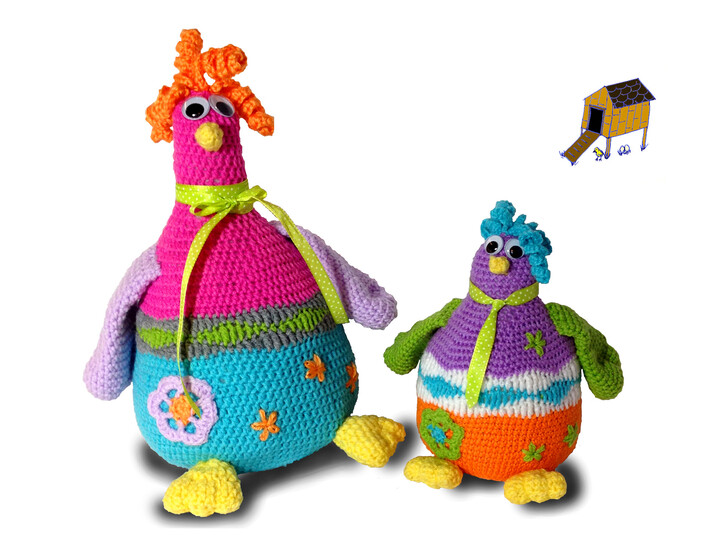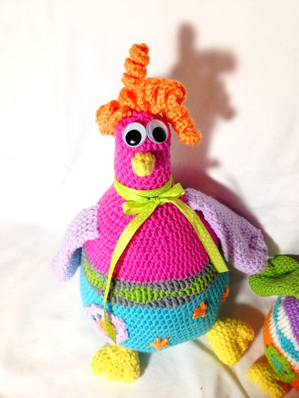 Die Anleitung enthält nur die Beschreibung für das kleine Huhn, das große Huhn wird nur mit einer anderen Maschenart gehäkelt, die in der Anleitung beschrieben ist.
