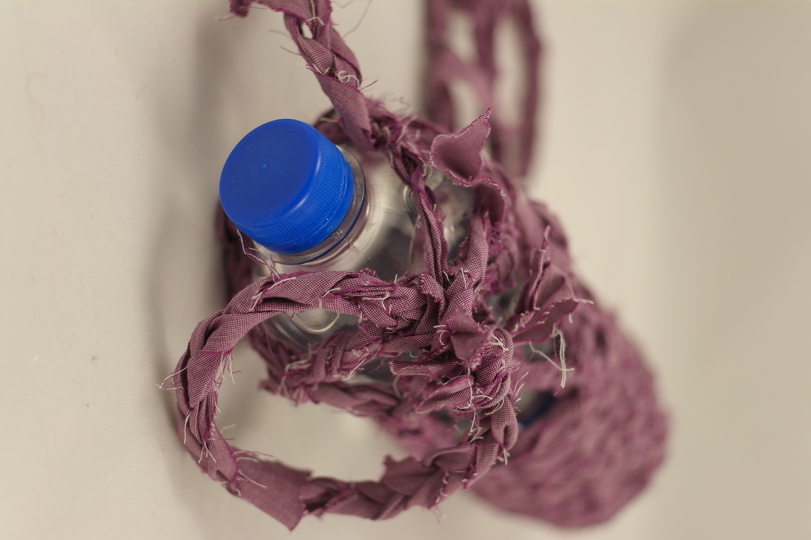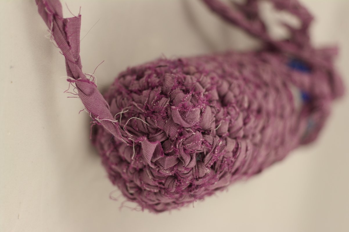 Der kleine Wasserträger ist ein kleines, schnelles und einfaches Projekt. Du brauchst ungefähr 2 Stunden Zeit, den Stoff von einem ausrangierten Hemd oder einer Bluse und eine Häkelnadel ca. 10mm. Der Stoff sollte nicht zu elastisch sein, damit die Tasche gut um die Flasche anliegt.