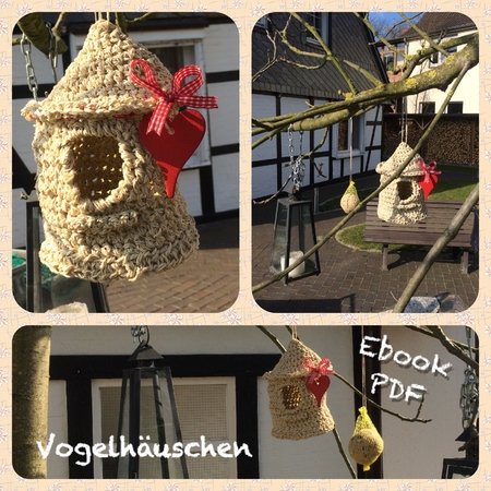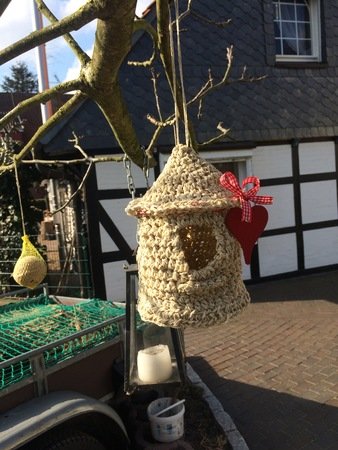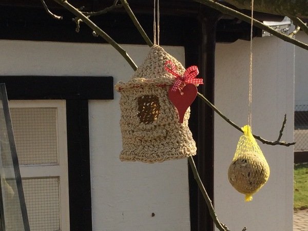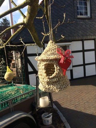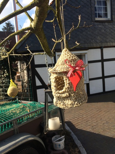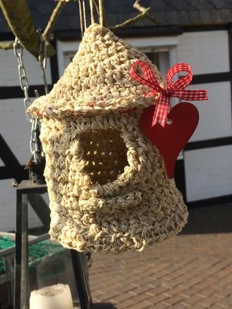 Häkelanleitung für ein Vogelhaus aus Paketschnur.