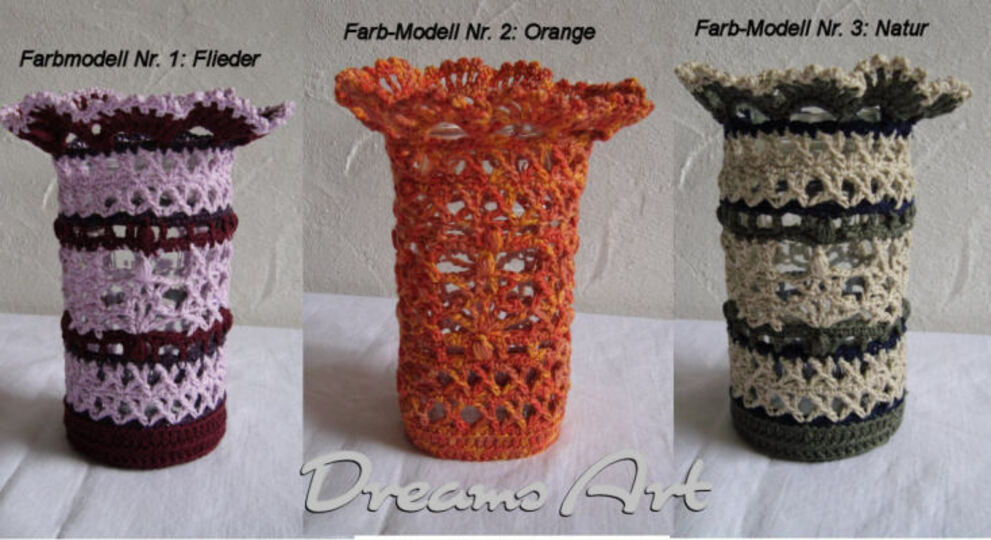 benötigtes Material: Baumwollgarn mit LL 125m / 50g, Häkelnadel Nr. 2,5 in 3 Farben. Bei einfarbigen Hüllen genügen 50g.