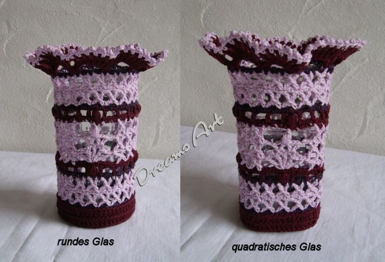 Hier bekommst du in elektronischer Form eine Häkelanleitung für eine Glashülle, Glashusse aus Baumwolle. Egal ob einfarbig oder bunt gemixt, sie ist ein abosluter Hingucker. Diese Glashülle passt auf gängige Konservengläser, die in jedem Supermarkt erhältlich sind. Sie haben eine Höhe von 16,5 cm und einen Umfang von 28 cm.