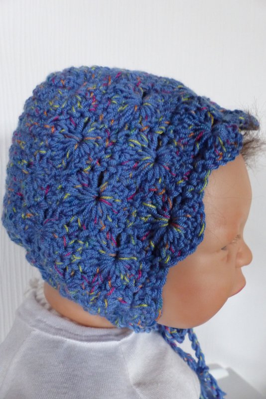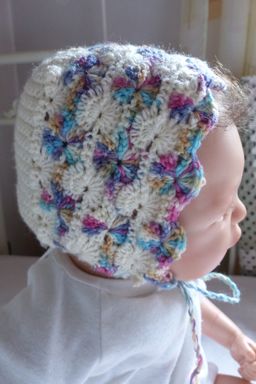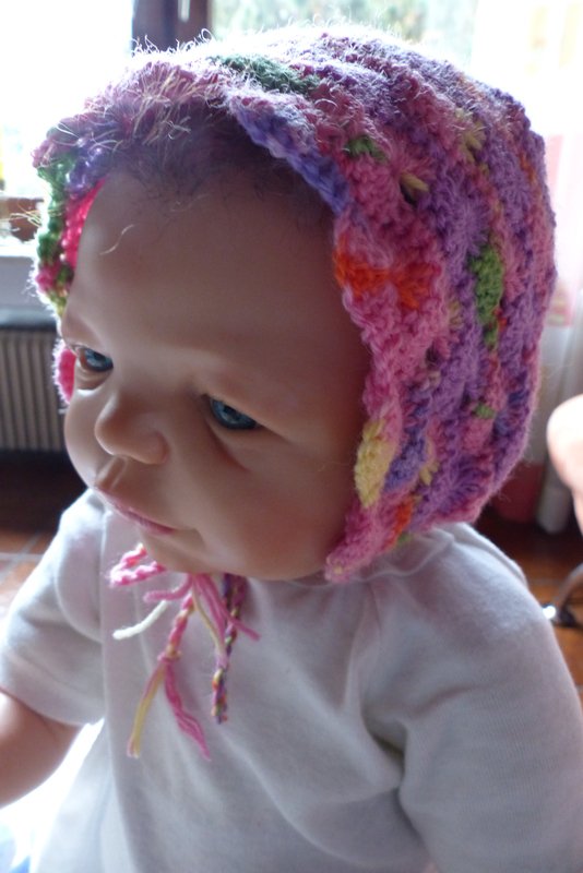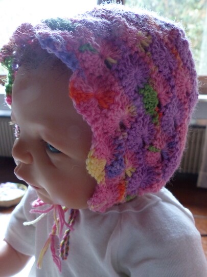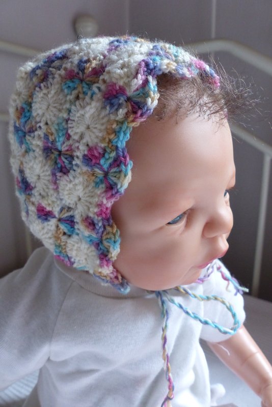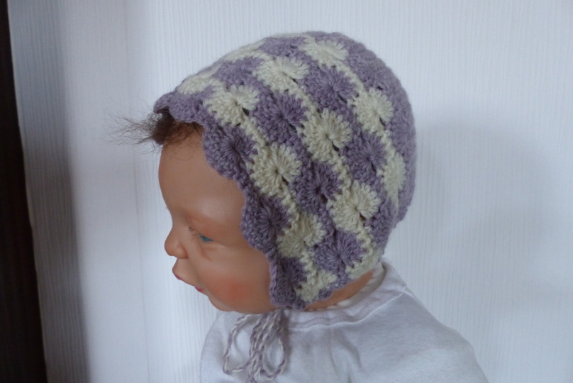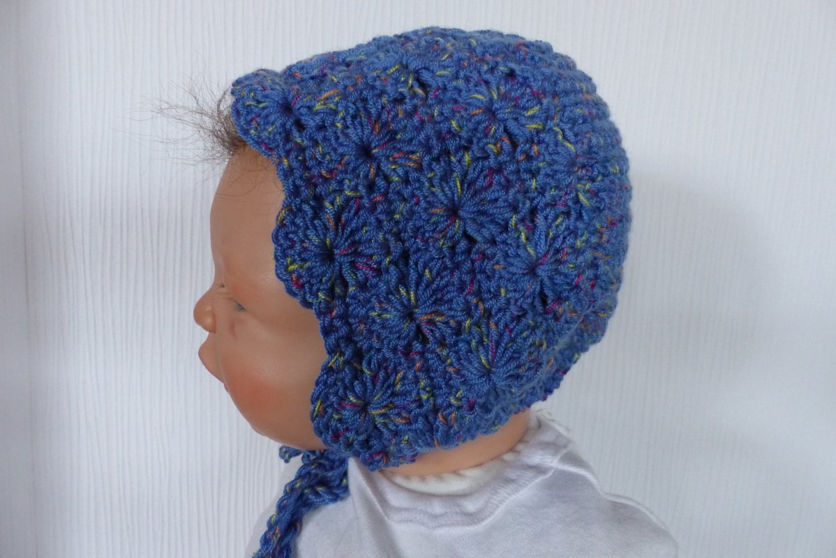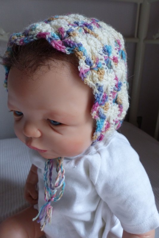 Gehäkelte Haube / Babymütze zum Binden für ein Neugeborenes.