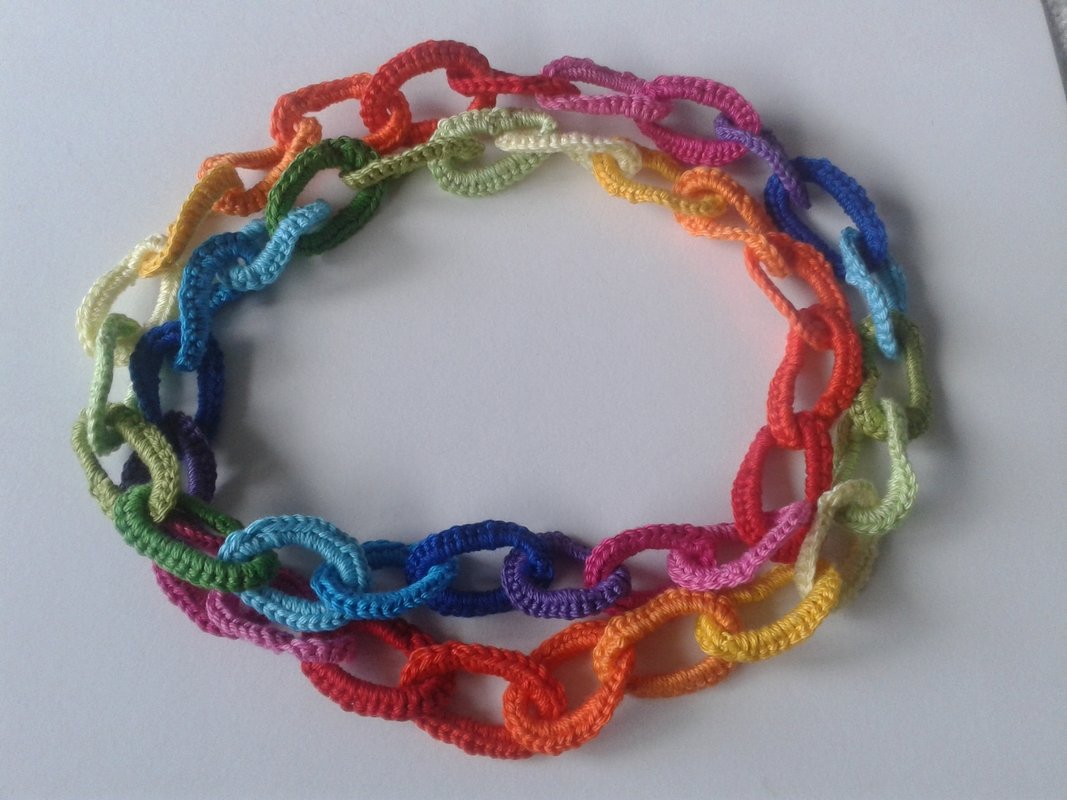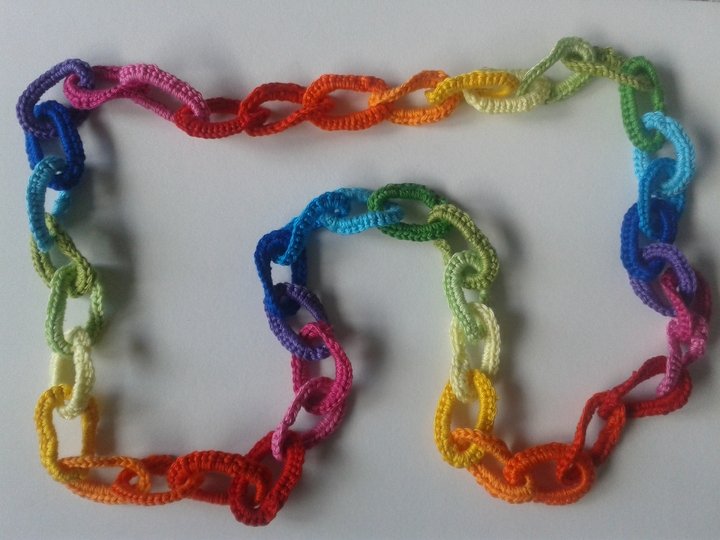 Diese Kette ist schnell gehäkelt. Du hast viele Reste, und keine Idee. Dann aber los.