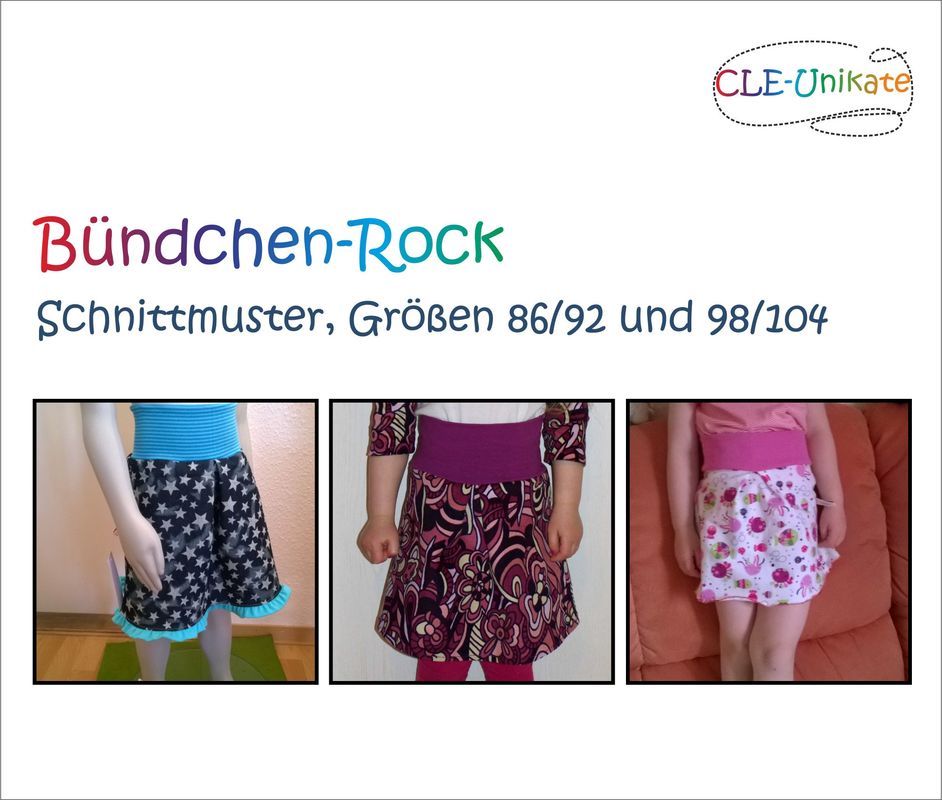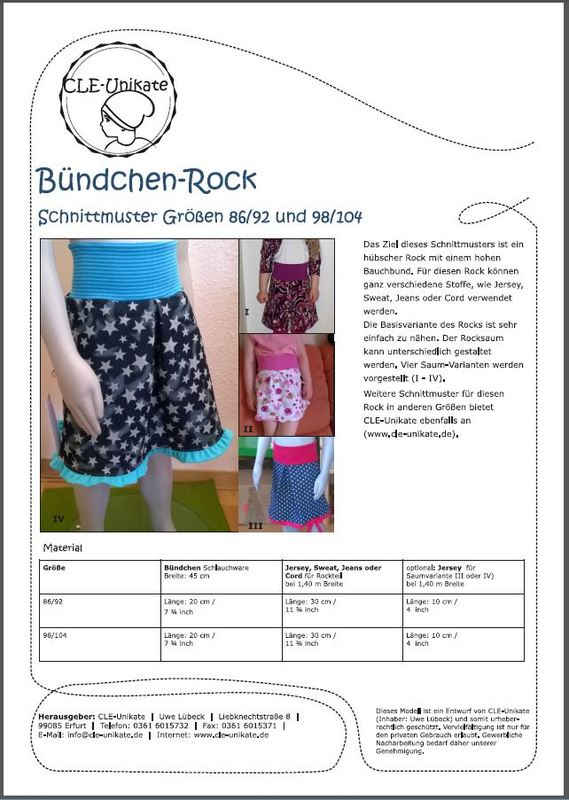 Das Ziel dieses Schnittmusters ist ein hübscher Rock mit einem hohen Bauchbund. Für diesen Rock können ganz verschiedene Stoffe, wie Jersey, Sweat, Jeans oder Cord verwendet werden. Die Basisvariante des Rocks ist sehr einfach zu nähen. Der Rocksaum kann unterschiedlich gestaltet werden. Vier Saum-Varianten werden vorgestellt.
