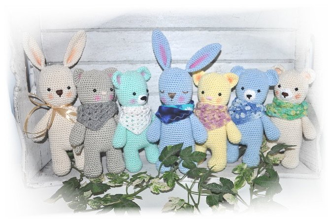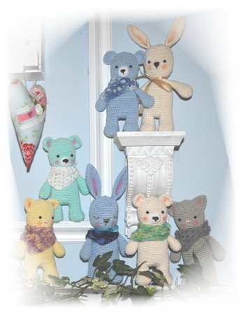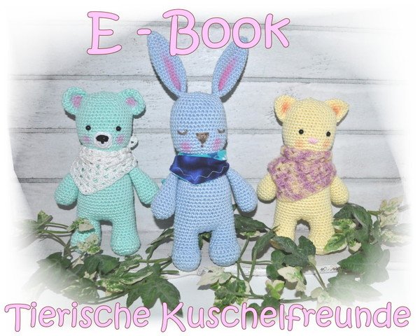 Einfach süß und zum lieb haben - die 3 tierischen Kuschelfreunde Katze, Teddy und Häschen. Wenn man in den Körper einen Rasselkörper einarbeitet kommt das bei den ganz Kleinen bestimmt auch sehr gut an. Die Figuren haben eine Größe zwischen 17cm und 22cm, also nicht zu groß und nicht zu klein.