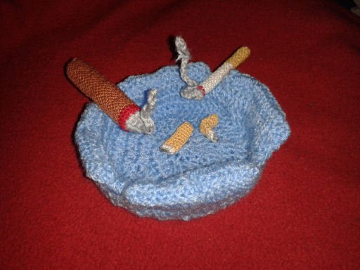einen Aschenbecher (Durchmesser 11 cm) mit Kippen,