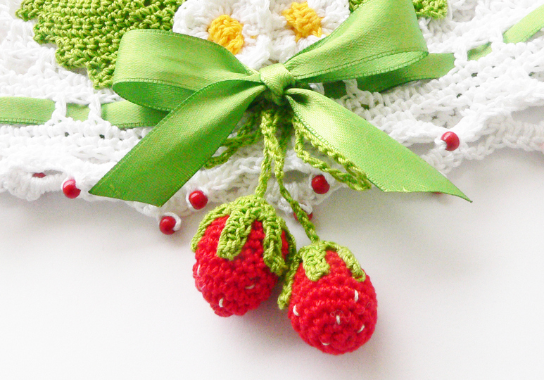 Die umfangreiche, reichlich bebilderte PDF-Häkelanleitung zum Häkeln von Mini-Erdbeeren mit einer Blume zum Dekorieren des Hauses und Kleidung oder als Mitbringsel für die Freunde oder Verwandte.