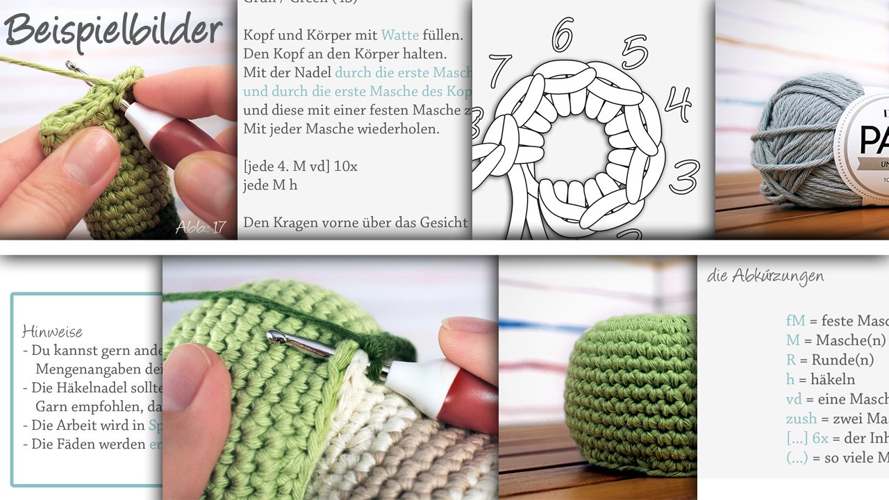 Die Häkelanleitung beinhaltet 12 Seiten mit über 20 Fotos und Schaubildern.