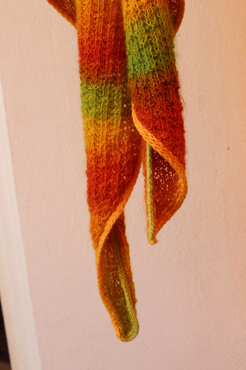 Das Tuch wird seitwärts gestrickt und kann daher jeder gewünschten Größe angepaßt werden. Bei der rosa/grauen Farbverlaufswolle habe ich im Gegensatz zu der braun melierten Wolle auf den I-Cord als Umrandung verzichtet. Bei der orange/gelb/grünen Farbverlaufwolle von Lang Yarns habe ich den I-Cord mit Baumwollgarnresten gestrickt.