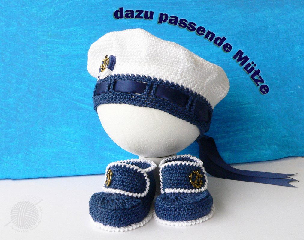 Die Häkelanleitung für die dazu passende Mütze finden Sie hier: https://www.crazypatterns.net/de/items/1359/matrosen-kapitaensmuetze-fuer-babys-kinder-alle-gr