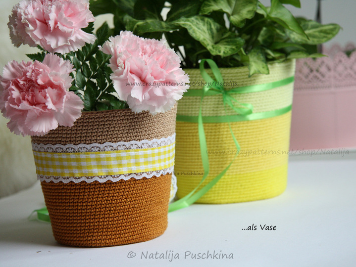 Anleitung umfasst auch Häkelschritte für 3D Häkelblumen. Mit diesen Blumen kannst Du Deine Körbchen (Töpfe) dekorieren. Die Datei wird im PDF-Format ausgeliefert, es gibt also keine Probleme beim Öffnen.