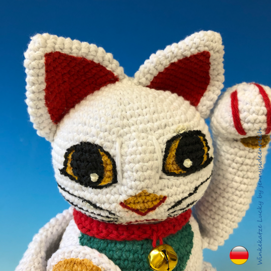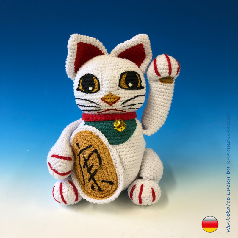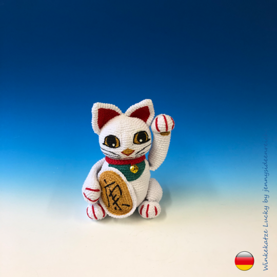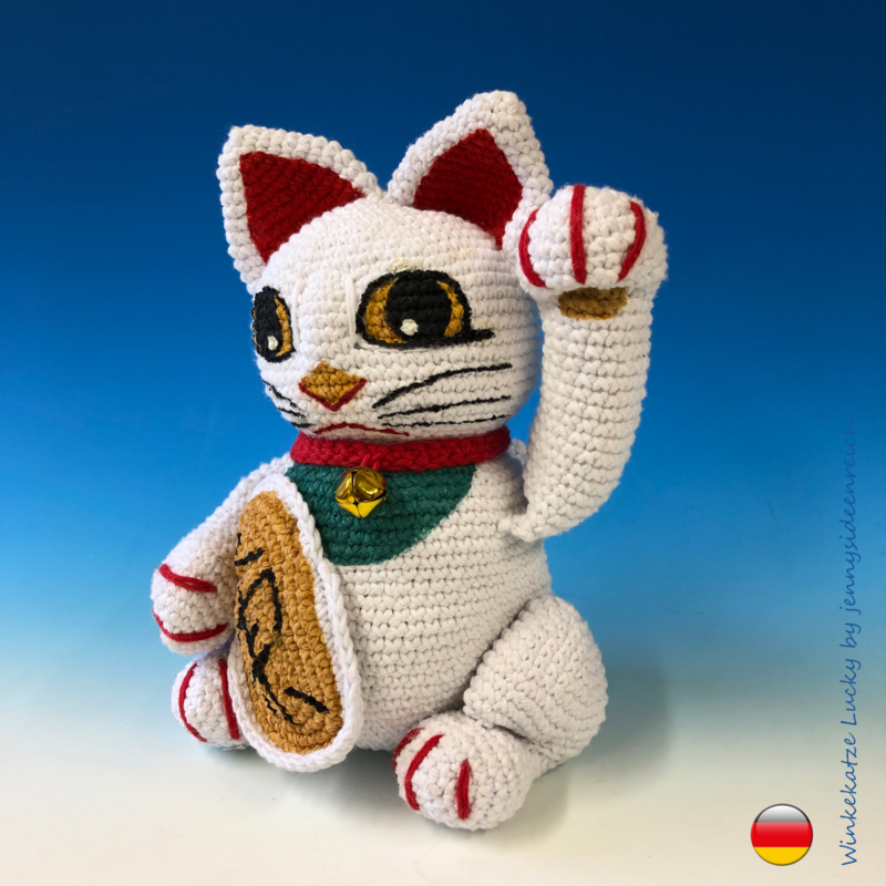 Ihr könnt hier die komplett ausformulierte Häkelanleitung zu Lucky der Winkekatze erwerben Sie ist 16 Seiten lang und besteht aus Texten und Bildern zu allen Einzelteilen.