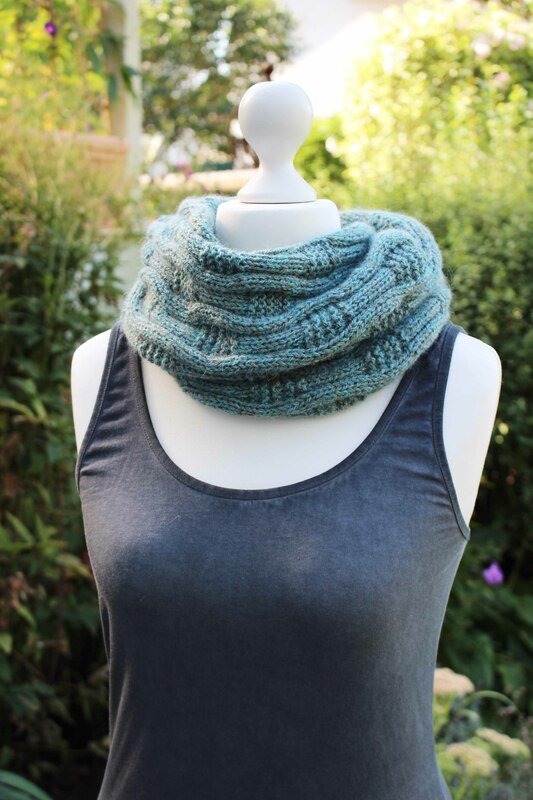 HINWEIS: Der Loop wird im Originalgarn durchgehend mit doppeltem Faden gestrickt, dafür wird 1 Faden in „Riverside“ und 1 Faden in „Jade Sea“ zusammengefasst!