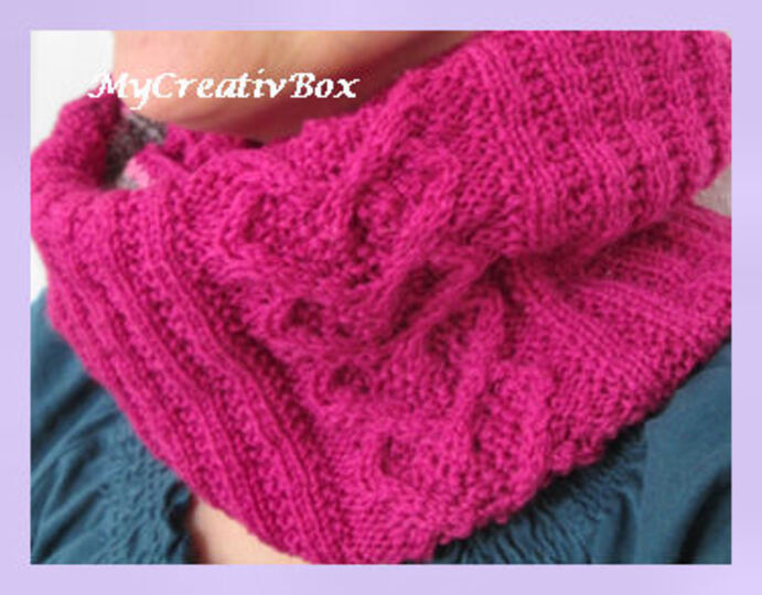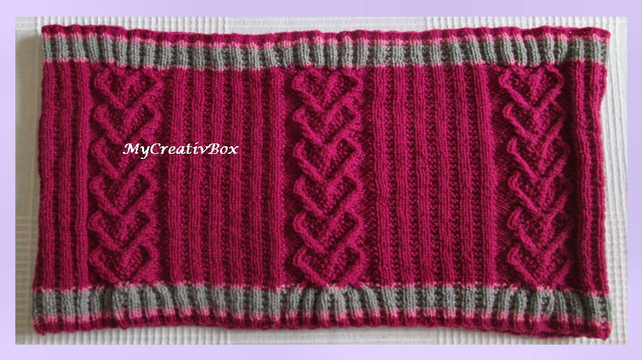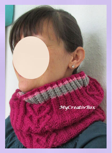 eine PDF-Datei mit der Strickanleitung für diesen kuschligen Loop mit dem Muster "Herz an Herz". Man kann ihn zwei mal um den Hals wickeln.
