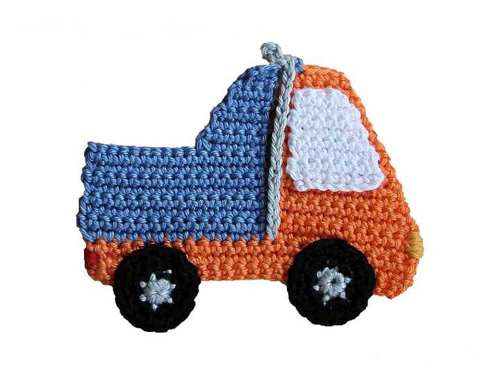 Diese tolle Applikation in Form eines Kipplasters ist schnell gehäkelt und macht sich toll als Dekoration auf einem Kissen, einem T-Shirt, Pullover, einer Mütze...