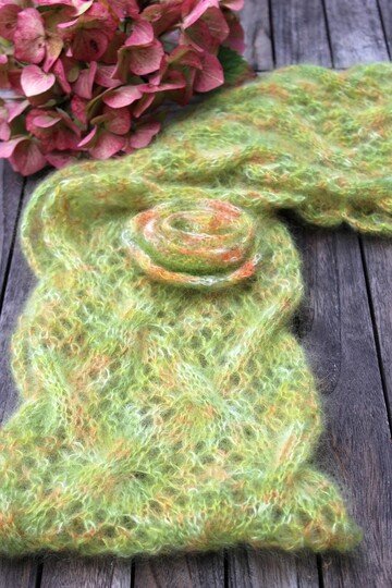 Ich habe ein mehrfarbiges und ein einfarbiges Mohair-Seidengarn verwendet und beides zusammen verstrickt. Natürlich könnt Ihr den Loop auch einfarbig stricken, das schöne Loch-Zopf-Muster kommt dann noch schöner zur Geltung! Es kann sowohl nach Strickschrift als auch nach schriftlicher Ausführung des Musters gearbeitet werden.