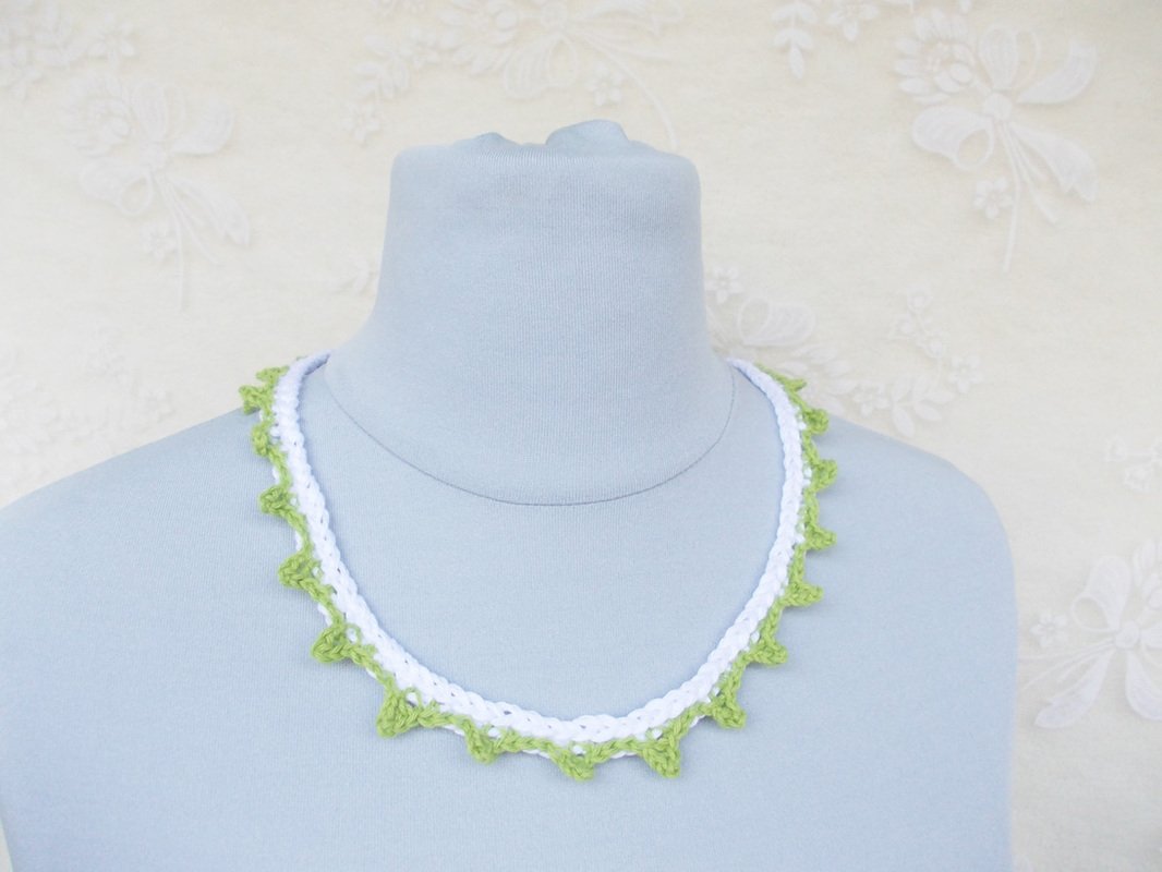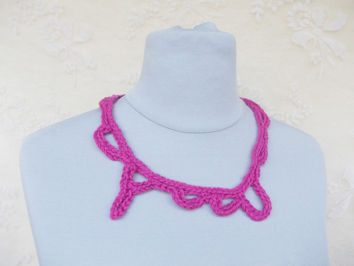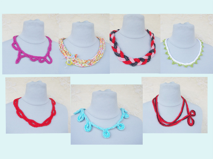 Bei den dargestellten Ketten habe ich 100 % Baumwolle verwendet, auf 50 g LL von mindestens 120 m oder mehr, geeignet für Nadelstärke 2 - 3. Ich habe den Faden doppelt genommen und mit Nadel Nr. 4 gehäkelt.