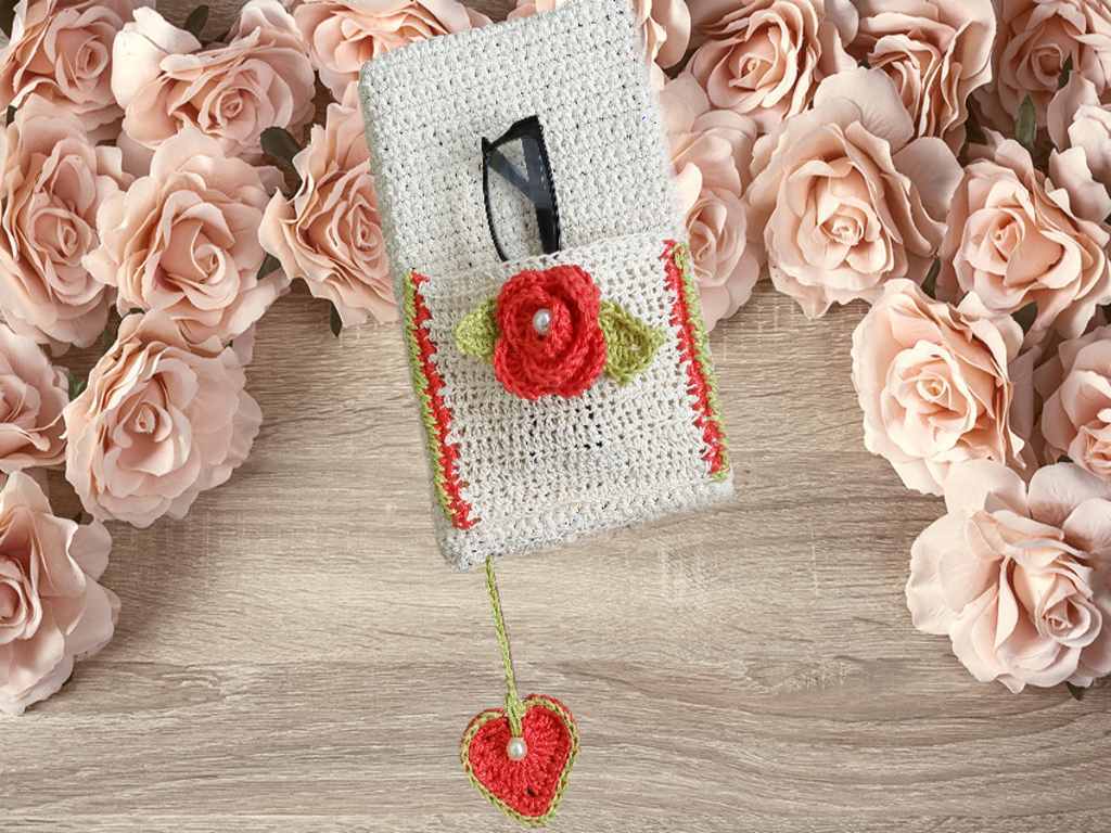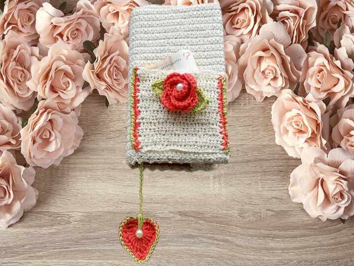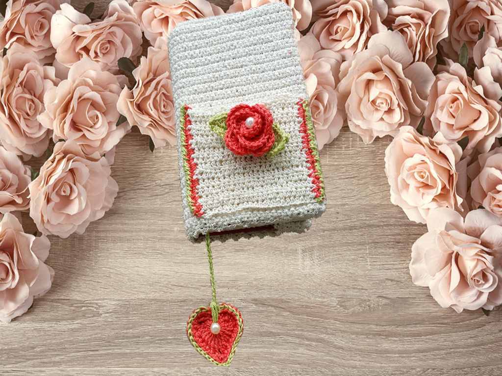 Das Herz als Lesezeichen ist gleich an die Buchhülle mit angehäkelt ,somit hat man alles komplett.
