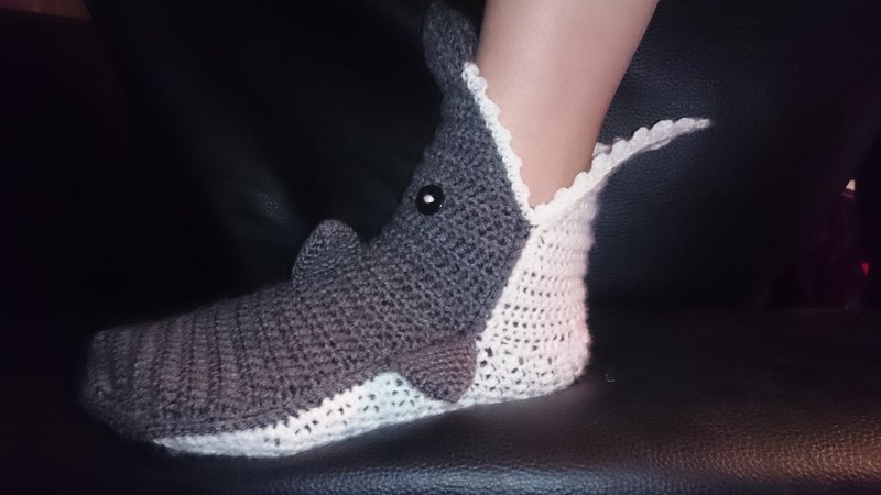 Die Haisocken bestehen aus mehreren Einzelteilen, die erst am Ende zusammen gehäkelt/vernäht werden. Die Sohlenlänge beträgt ca. 25,3 cm und die breite 9,5 cm