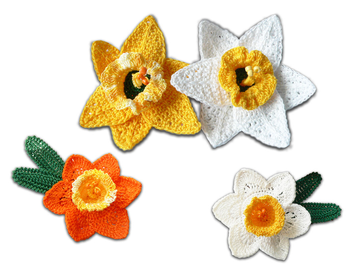 Es wird in der Häkelanleitung erklärt: große Narzisse, kleine Narzisse, Blatt, Blütenboden.